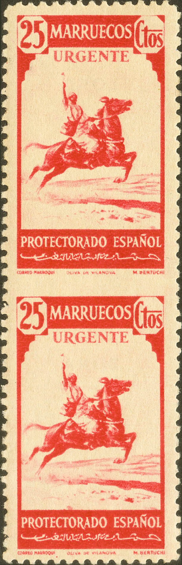 ★★ 216spv. 1940. 25 cts rojo, pareja vertical. SIN DENTAR ENTRE LOS SELLOS. MAGNIFICA Y RARA. Edifil 2018: +165 Euros