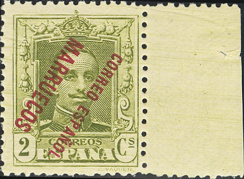 ★★ 17hi. 1923. 2 cts verde oliva, borde de hoja. SOBRECARGA INVERTIDA. MAGNIFICO. Edifil 2018: +32 Euros