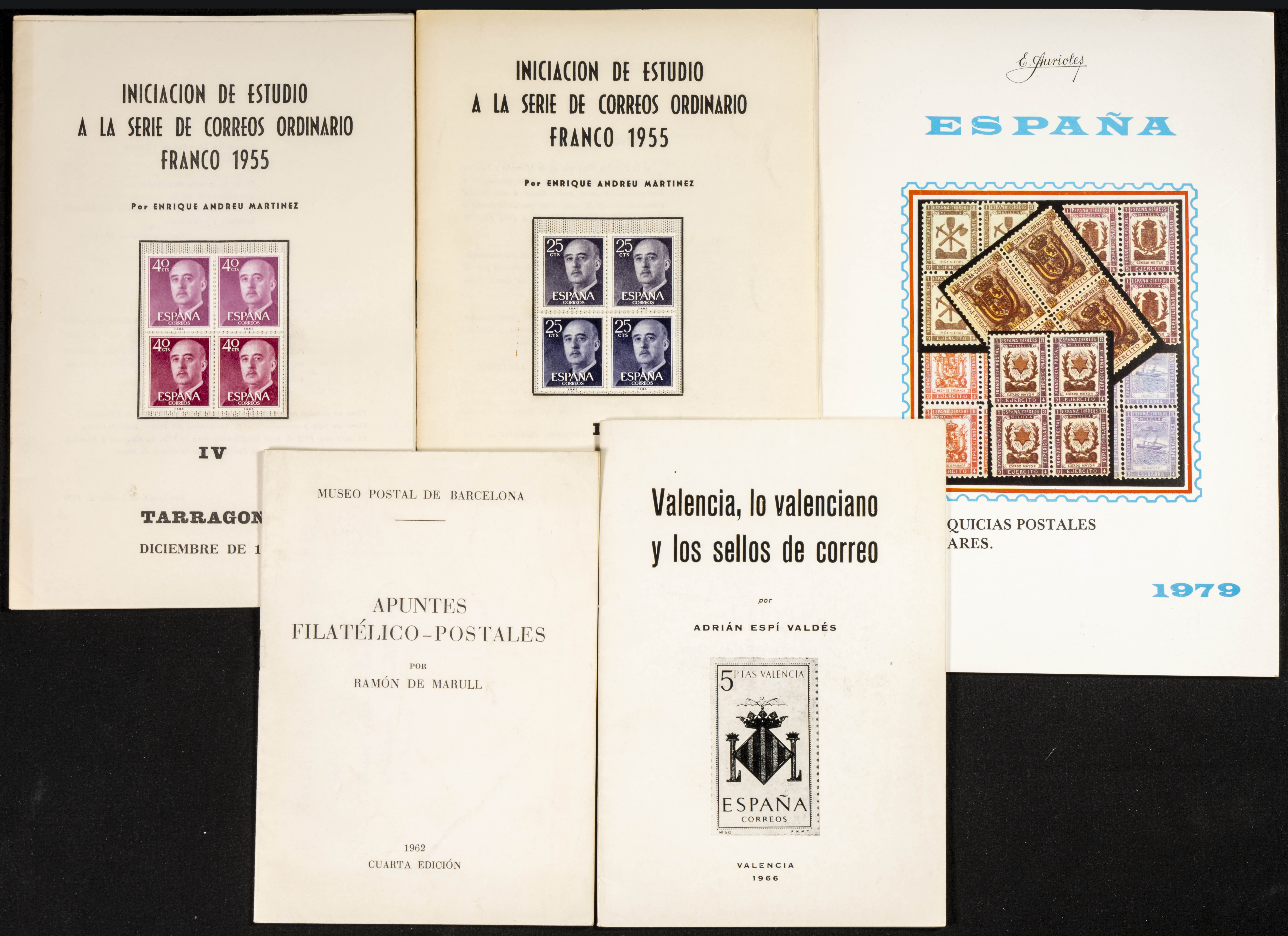 (1973ca). Conjunto de cinco obras filatélicas: APUNTES FILATELICO-POSTALES de Juan de Marull en 1962, VALENCIA, LO VALENCIANO Y LOS SELLOS DE CORREO de Adrián Espí en 1966, INICIACION DE ESTUDIO A LA SERIE DE CORREO ORDINARIO FRANCO 1955 TOMOS III y IV de Enrique Andreu en 1973 y 1974 y FRANQUICIAS POSTALES MILITARES de E.Aurioles en 1979. MAGNIFICAS.
