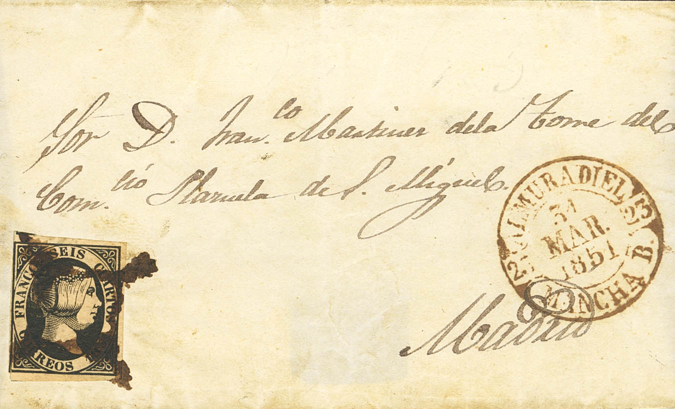 6. 1851. 6 cuartos negro. ALMURADIEL (CIUDAD REAL) a MADRID. MAGNIFICA Y MUY RARA.
