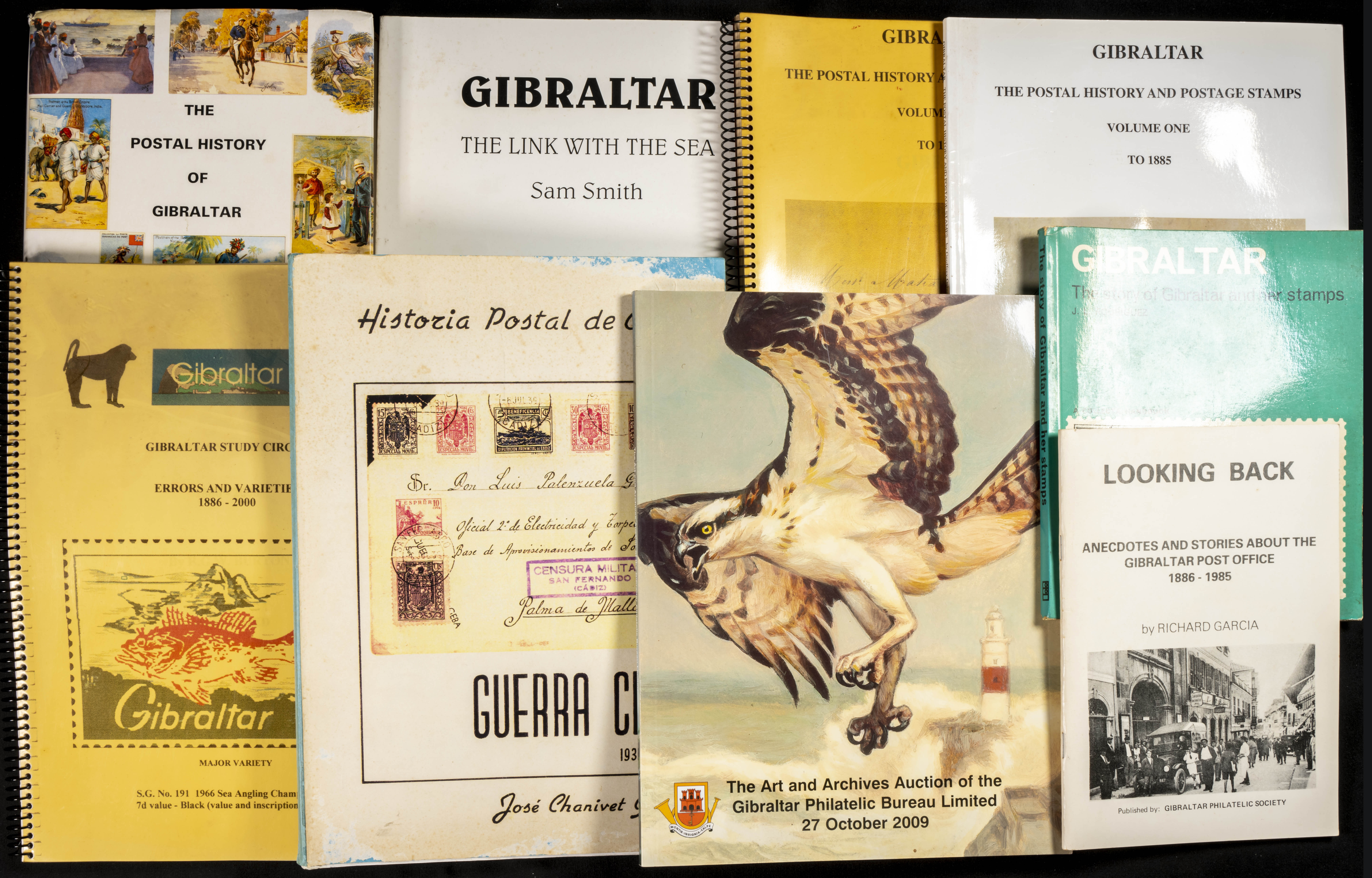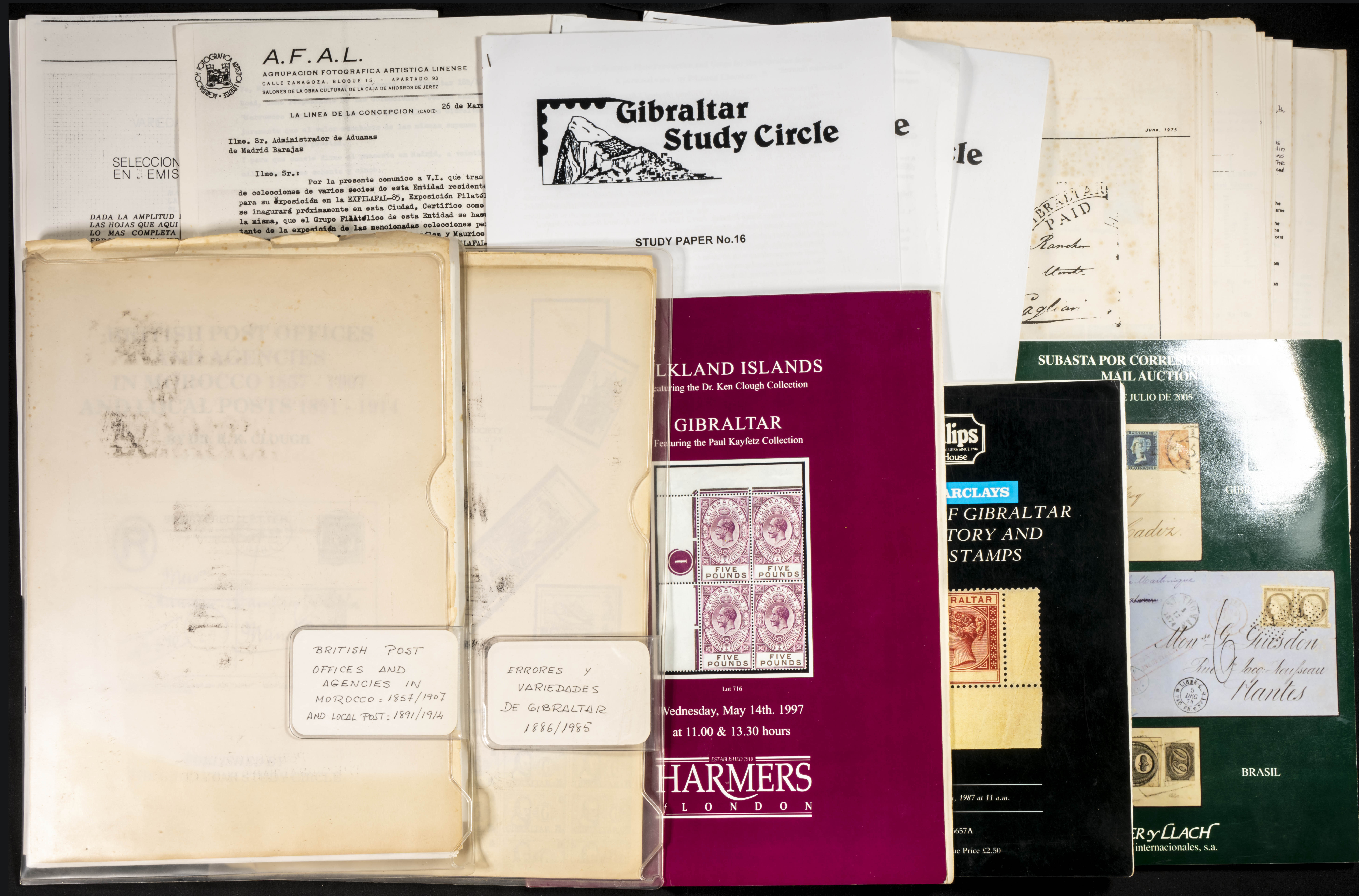 (1975ca). Interesantísimo conjunto con revistas, folletos, libros y catálogos de subastas referentes a sellos, variedades e Historia Postal de Gibraltar de diversos periodos, destacando el juego completo (Nº1 a 98) del Gibraltar Study Circle-The Rock encuadernado (seis volúmenes) y libros The Link with the sea, The Postal History of Gibraltar de 1998 y The Postal History and Paostage Stamps de Geoffrey Osborn 1995, entre otros. A EXAMINAR.