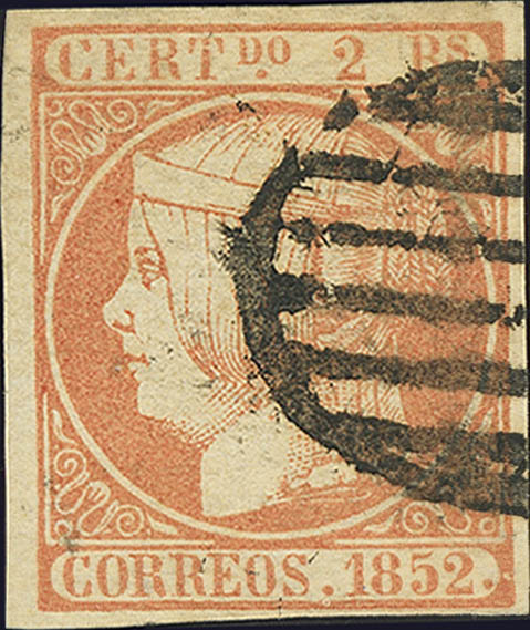 14. 1852. 2 reales naranja pálido. Buen color y márgenes. MAGNIFICO. Cert. EXFIMA.