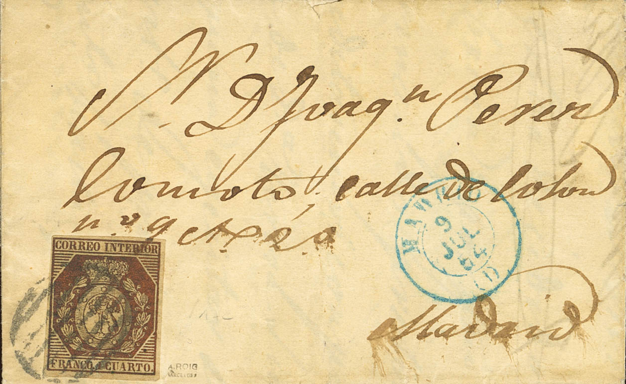 22. 1854. 1 cuarto bronce dorado (color intenso y márgenes grandes). Correo Interior de MADRID. Matasello PARRILLA. MAGNIFICA Y RARA. Cert. GRAUS.