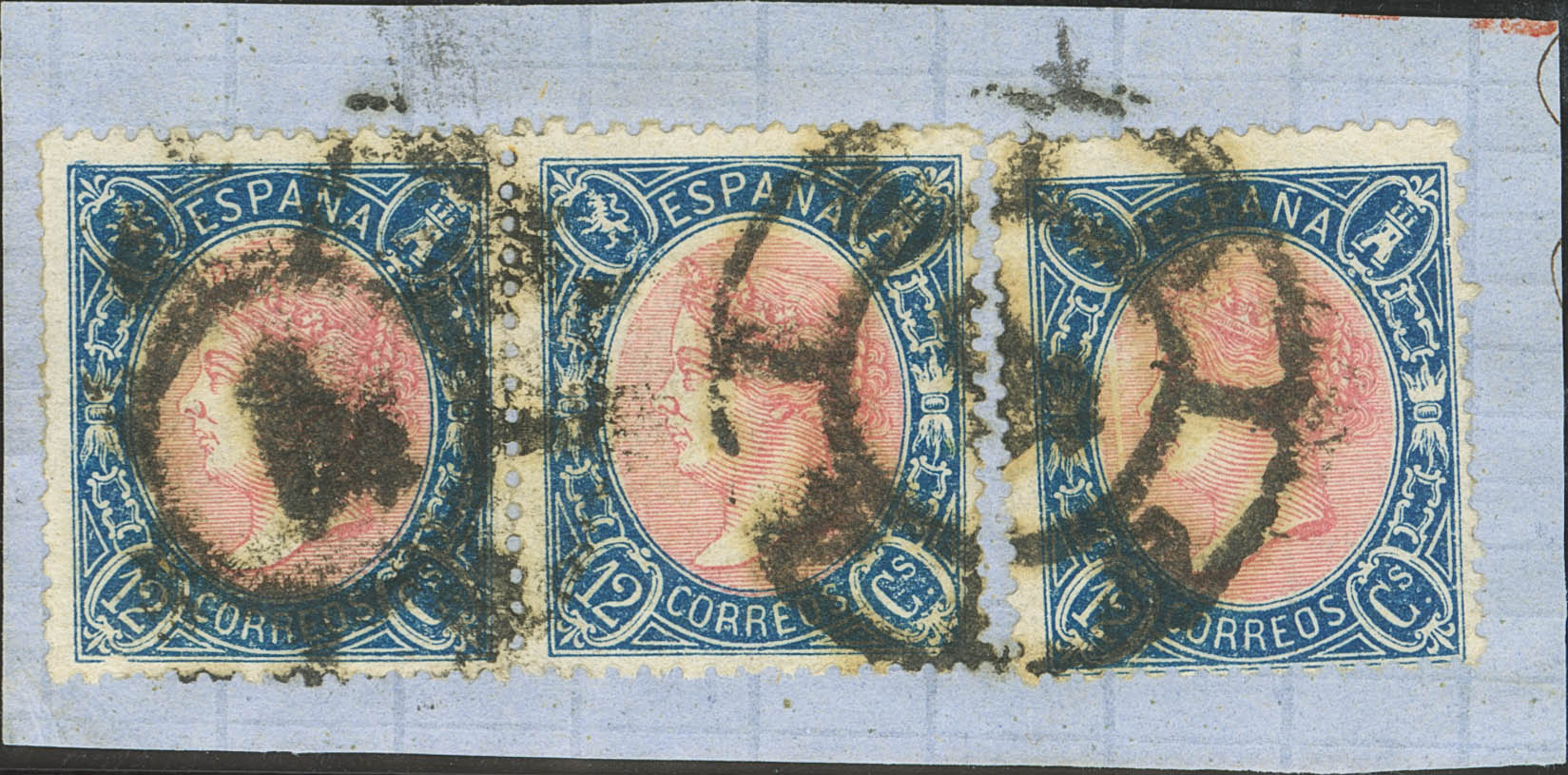 76(2), 76itb. 1865. 12 cuartos azul y rosa, tres sellos, sobre fragmento. Un sello variedad LINEA BLANCA VERTICAL. MAGNIFICA.