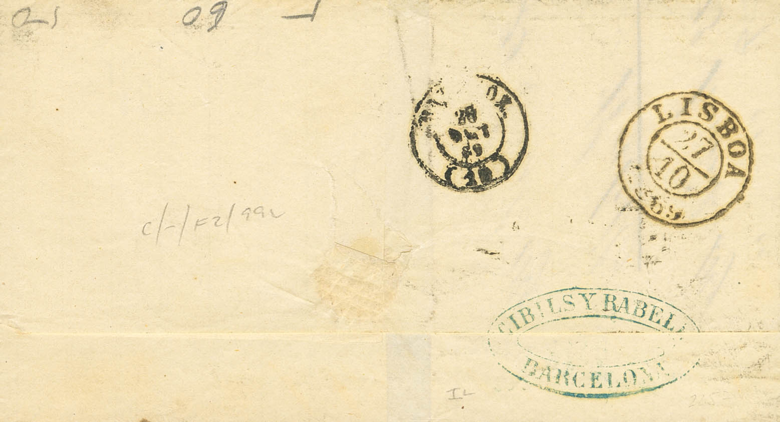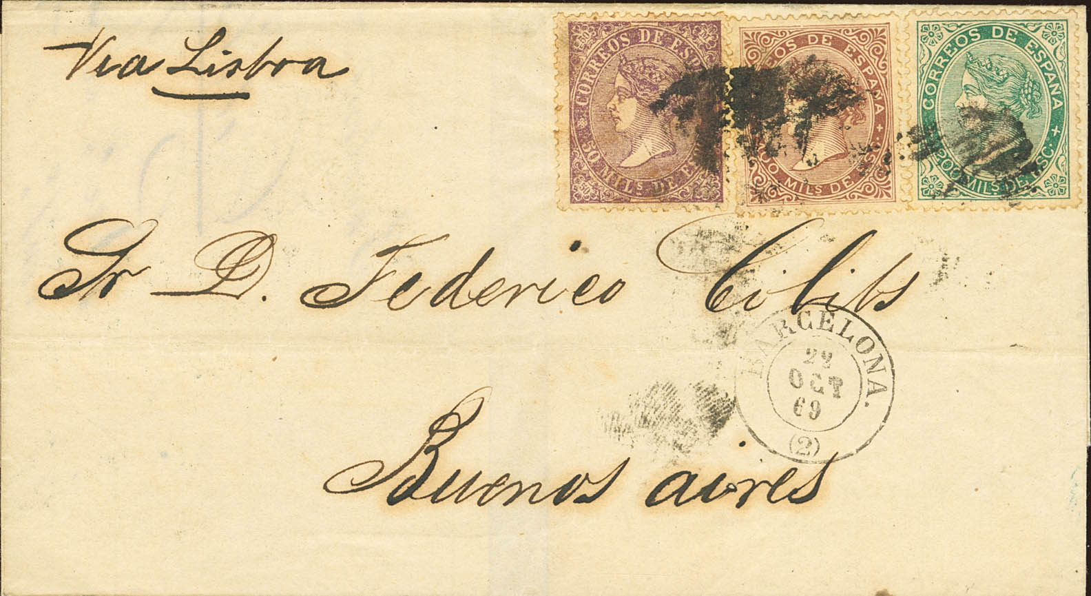 98, 99, 100. 1869. 50 mils violeta, 100 mils castaño y 200 mils verde. BARCELONA a BUENOS AIRES (ARGENTINA). MAGNIFICA Y RARO FRANQUEO TRICOLOR COMPLETANDO LA TARIFA DE 350 MILS VIA PORTUGAL.