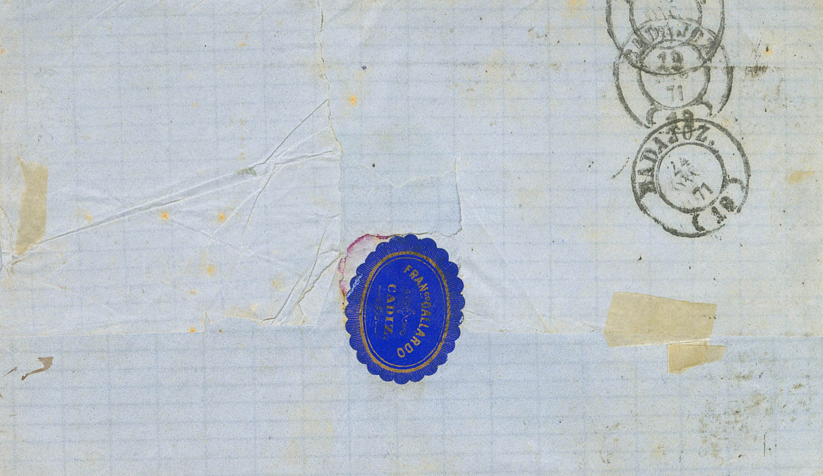 107(7). 1871. 50 mils ultramar, dos parejas y una tira de tres. CADIZ a BUENOS AIRES (ARGENTINA). MAGNIFICA Y ESPECTACULAR COMBINACION PARA COMPLETAR EL FRANQUEO A ARGENTINA DE 350 MILS.