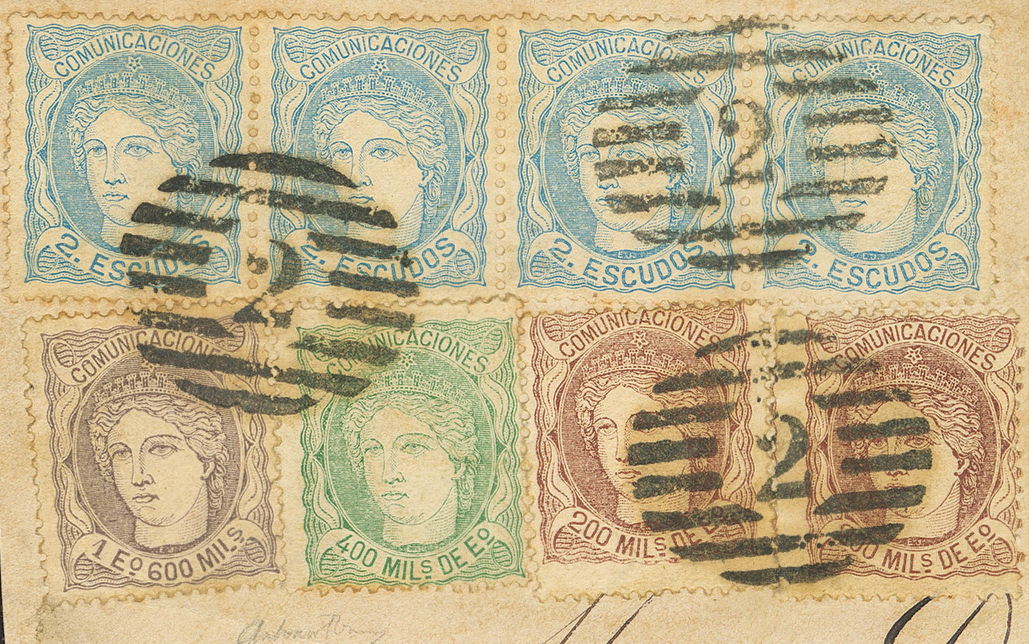 △ 109(2), 110, 111, 112(4). 1870. 200 mils castaño, dos sellos, 400 mils verde, 1600 mils violeta y 2 escudos azul, tira de cuatro, sobre fragmento. Matasello PARRILLA CON Nº2, de Barcelona. MAGNIFICO Y RARISIMO Y ESPECTACULAR FRANQUEO, SIN DUDA UNA DE LAS PIEZAS MAS IMPORTANTES DE LA EMISION DE LA MATRONA, QUE INCLUYE LOS DOS VALORES MAS IMPORTANTES DE LA EMISION. Cert. GRAUS.