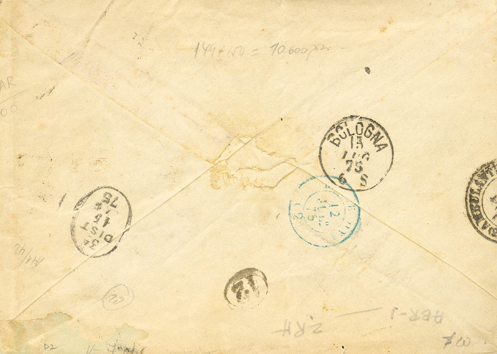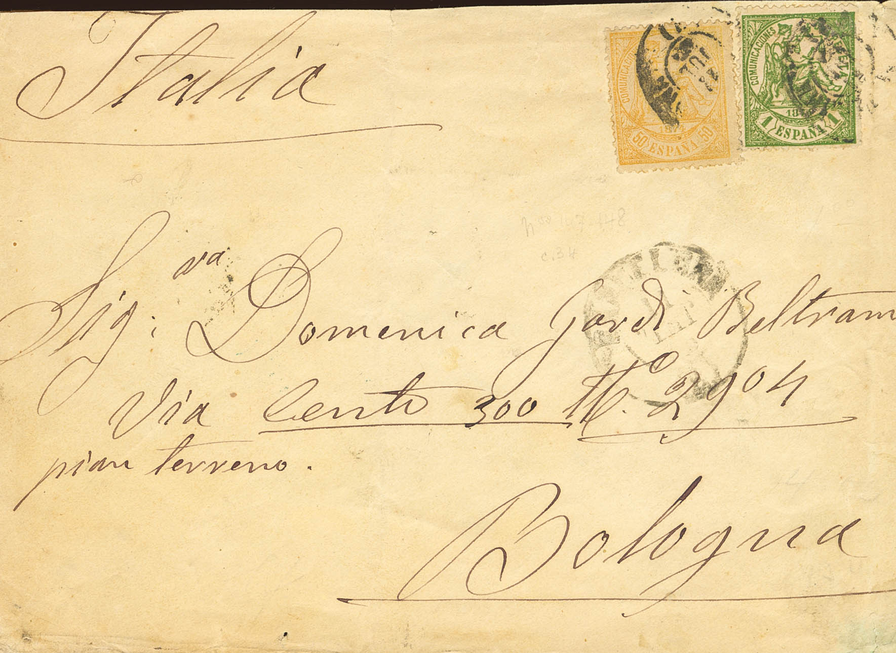 149, 150. 1875. 50 cts amarillo y 1 pts verde. BARCELONA a BOLONIA (ITALIA). MAGNIFICA Y MUY RARA INCLUYENDO EL 1 PTS.