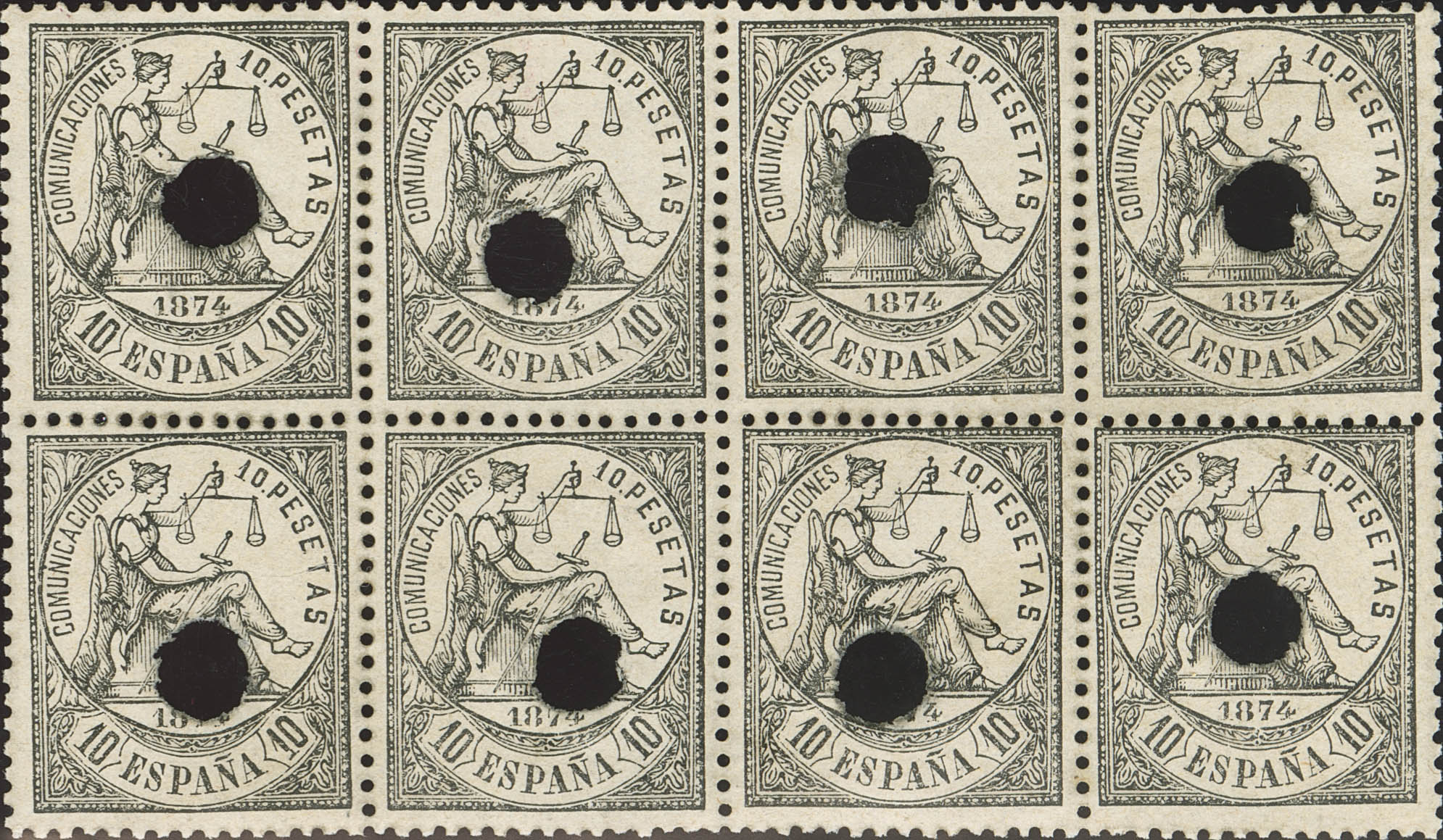 152T(8). 1874. 10 pts negro, bloque de ocho. TALADRO, de Telégrafos. MAGNIFICO Y MUY RAROS LOS BLOQUES DE ESTE VALOR CON TALADRO.