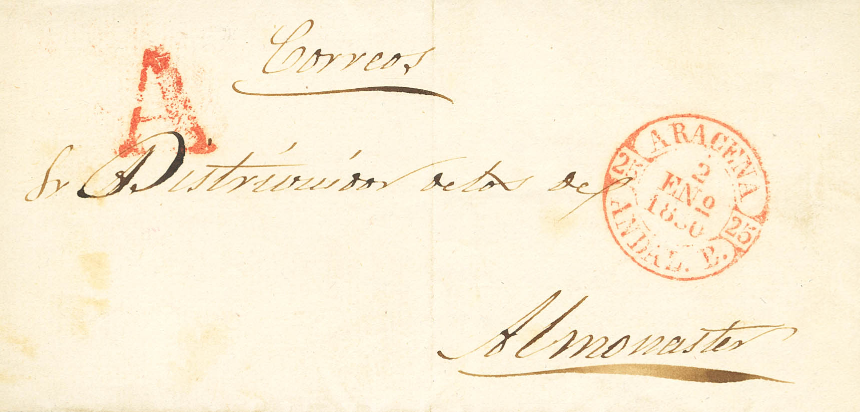 1850. ARACENA (HUELVA) a ALMONESTER LA REAL (HUELVA). En el frente ARACENA / 2-ENº-1850 / ANDAL.B y marca de abono "A", de Aracena (P.E.7) edición 2004. MAGNIFICA Y RARISIMA.