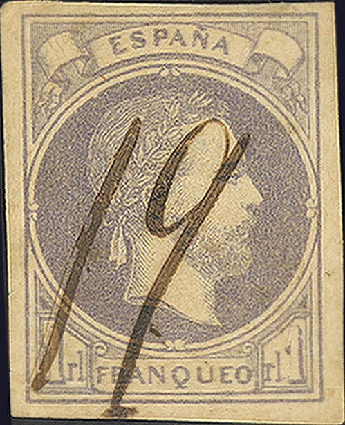 158. 1874. 1 real violeta (puntitos claros). Matasello manuscrito "19", de Bermeo. MAGNIFICO Y RARO.