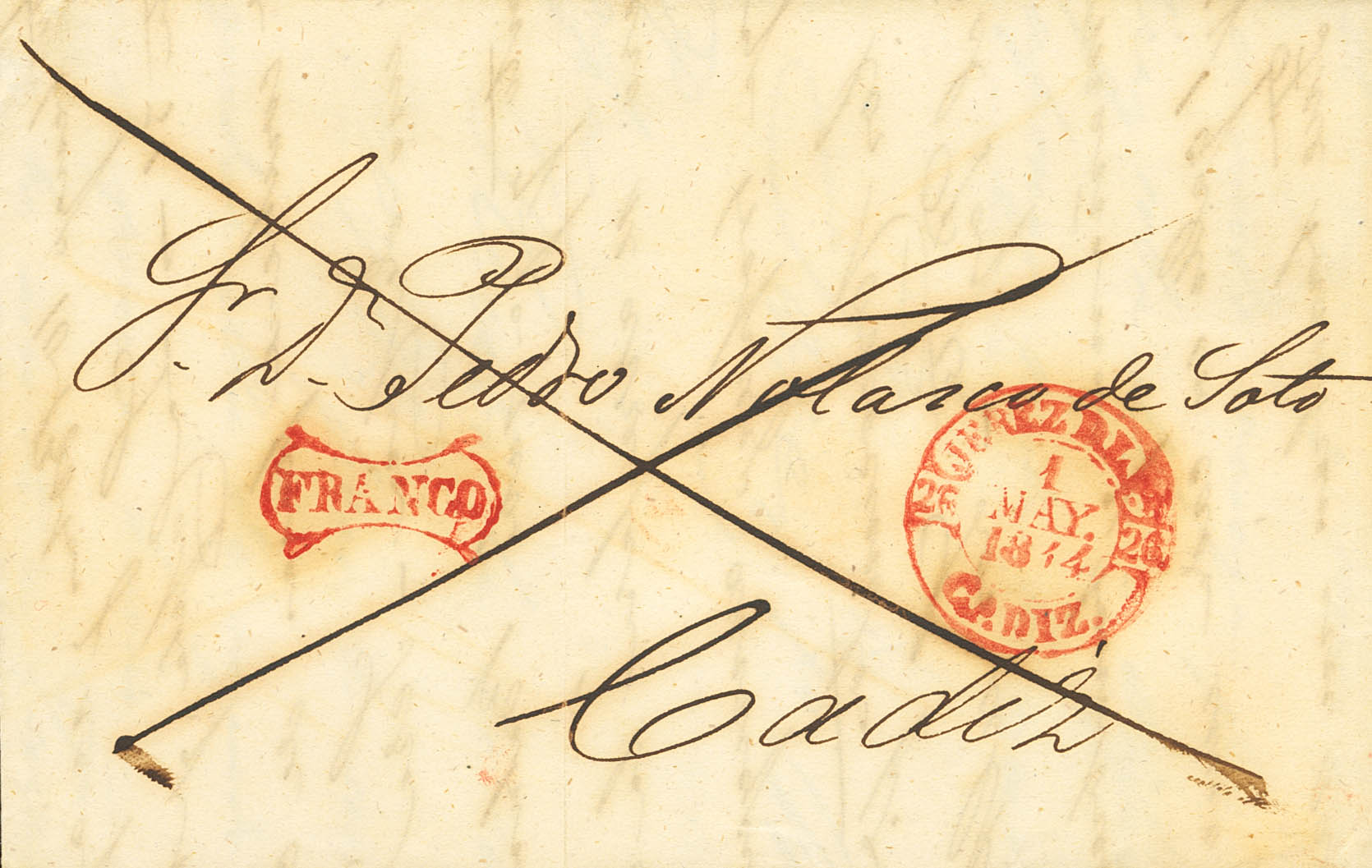 1844. JEREZ DE LA FRONTERA a CADIZ. Baeza JEREZ D.L.F. / CADIZ y marca FRANCO (P.E.6) edición 2004. MAGNIFICA Y RARISIMA.