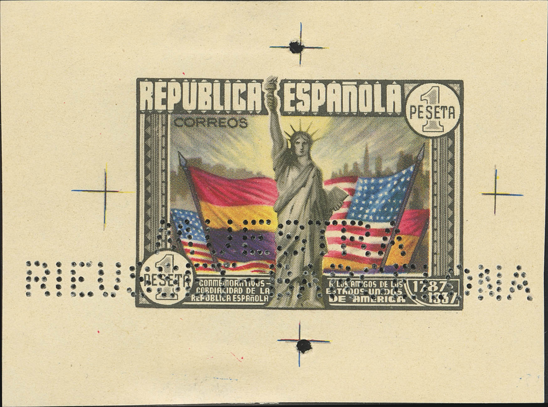 (★) 763P. 1938. 1 pts multicolor. PRUEBA DE PLANCHA y perforado MUESTRA / RIEUSSET BARCELONA. MAGNIFICA Y RARA. (Gálvez, 3244 similar con perforación)
