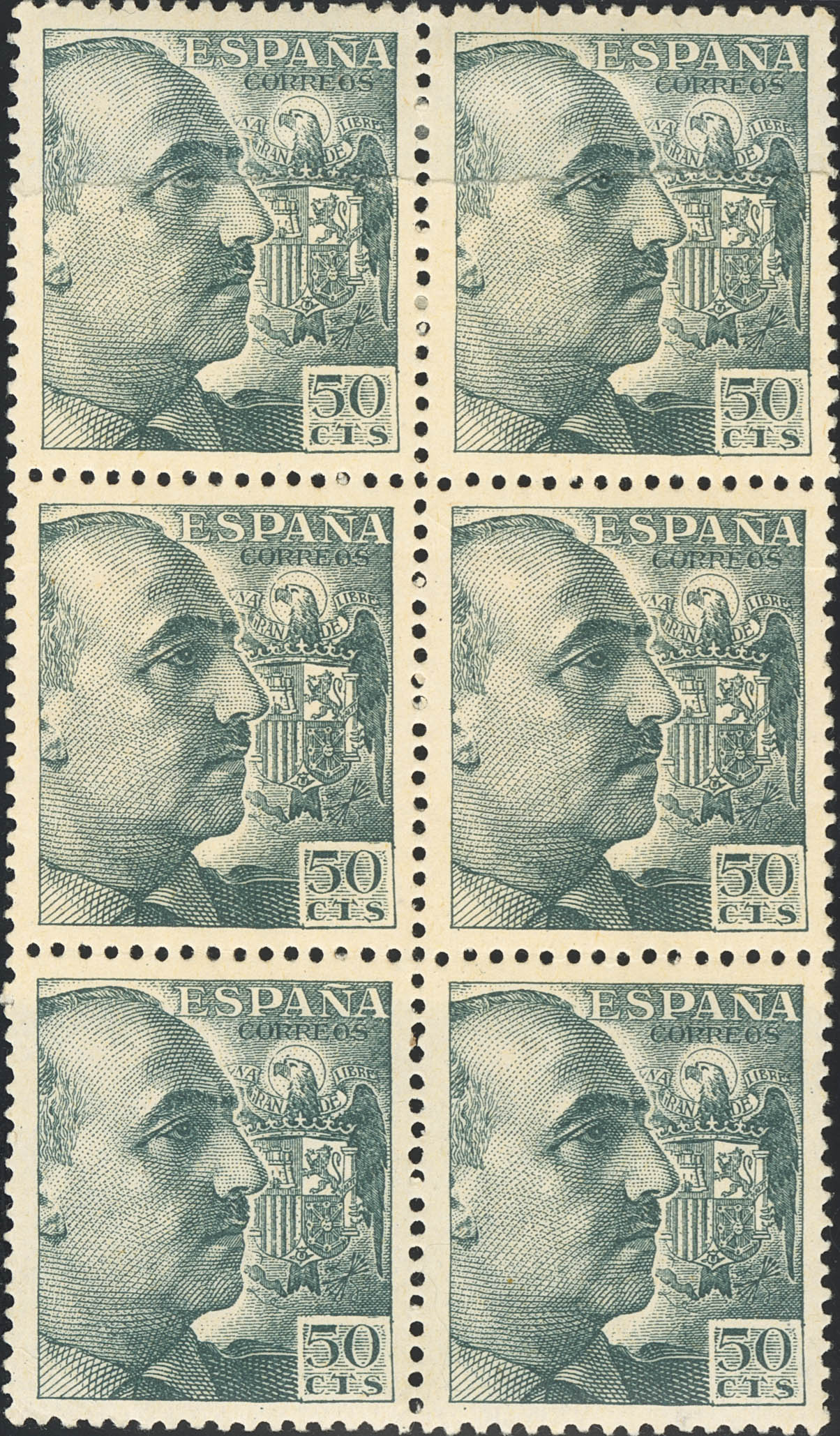 ★★/★ 1053x(6). 1949. 50 cts gris, bloque de seis. Variedad por EMPALME DEL PAPEL. MAGNIFICO.