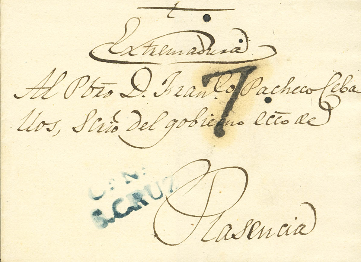 (1832ca). SANTA CRUZ DE RETAMAR (TOLEDO) a PLASENCIA. Marca Cª Nª / S. CRUZ, en azul (P.E.1) edición 2004. MAGNIFICA Y EXTRAORDINARIAMENTE RARA.