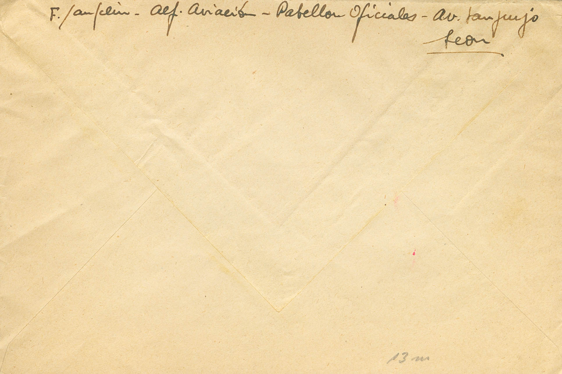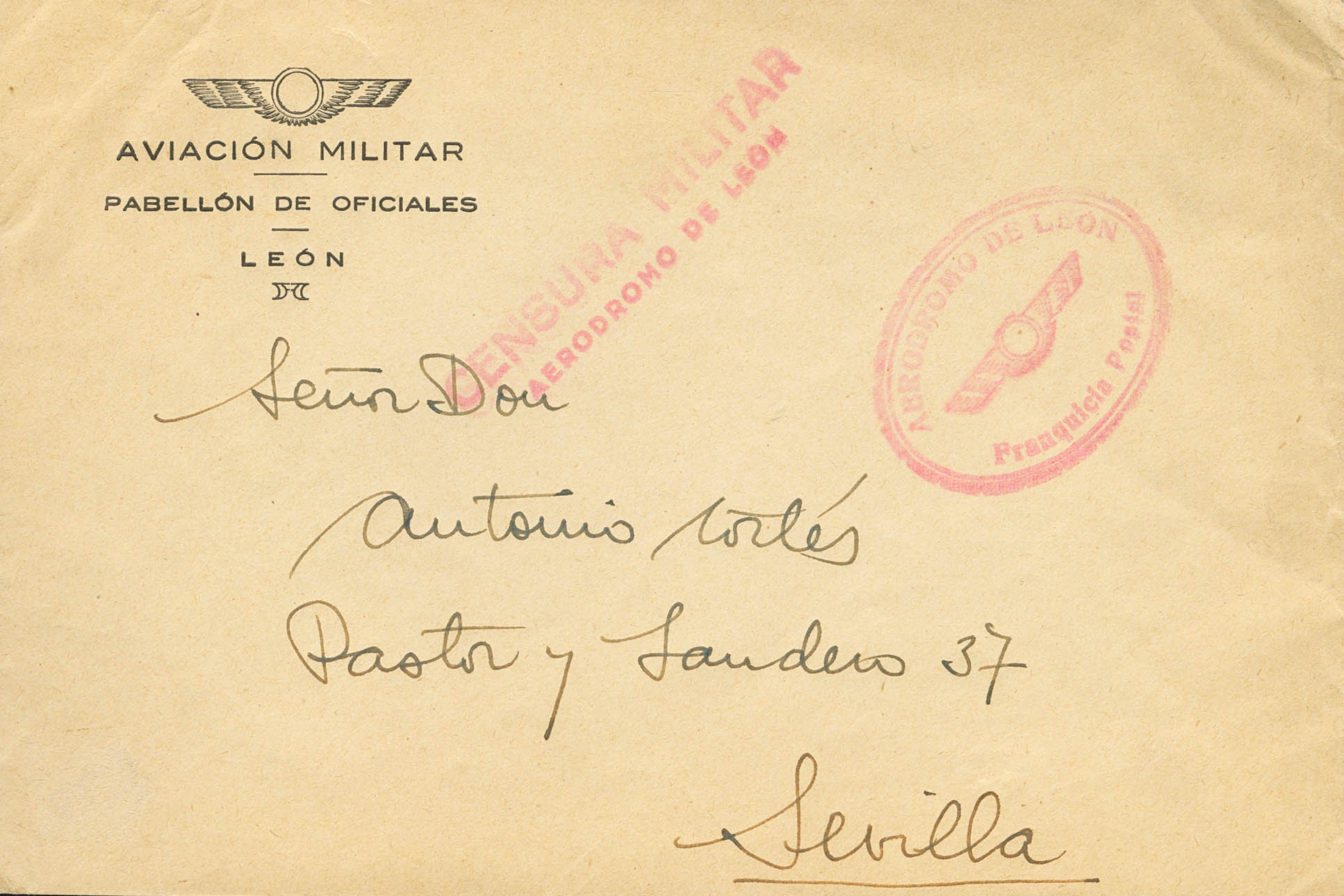 (1937ca). LEON a SEVILLA. Marcas AERODROMO DE LEON / FRANQUICIA POSTAL y CENSURA MILITAR / AERODROMO DE LEON, ambas en rojo. MAGNIFICA Y RARA.