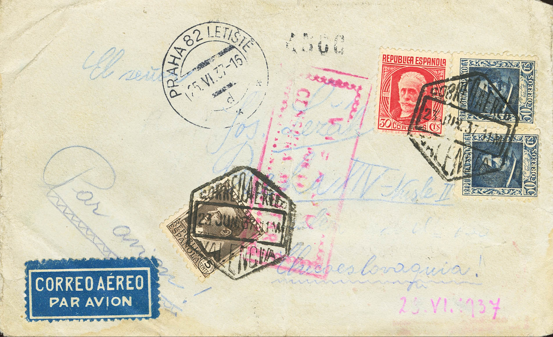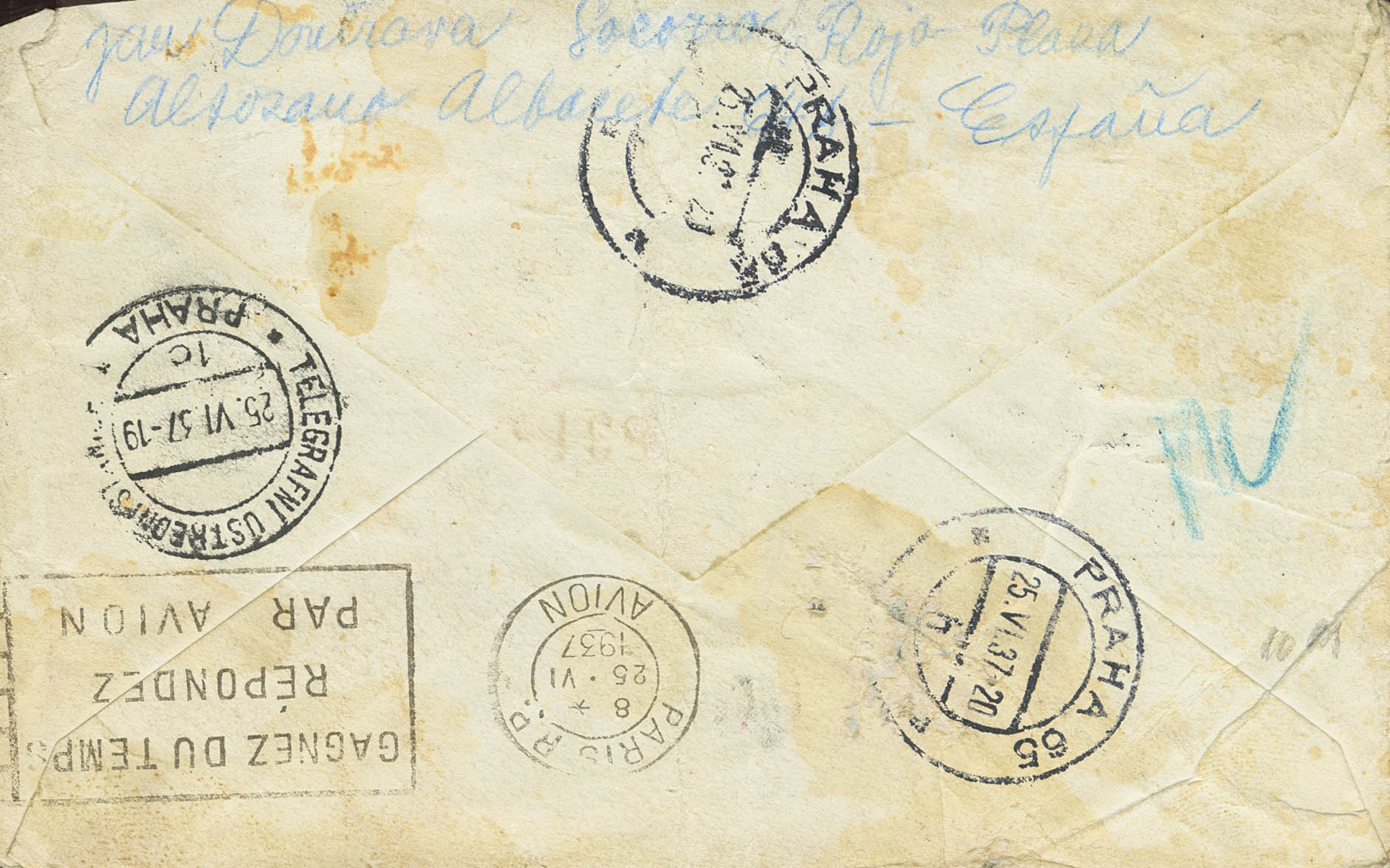 734, 738(2), 681. 1937. 30 cts rojo, 50 cts azul, dos sellos y 5 cts castaño. Brigadas Internacionales de ALBACETE a CHECOSLOVAQUIA. Al dorso remite desde Socorro Rojo Plaza del Altozano, tránsito PARIS y llegada. MAGNIFICA.
