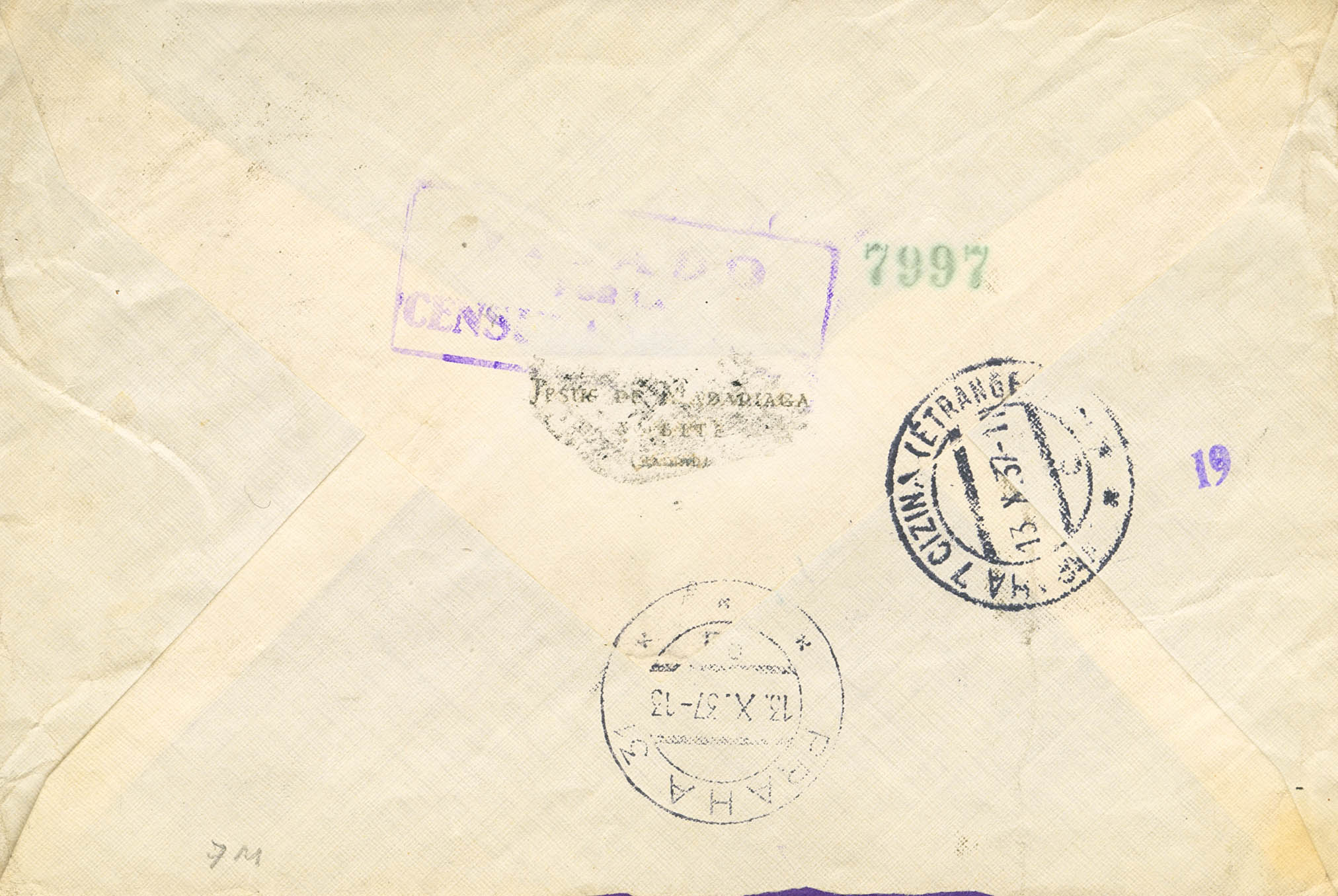1937. 1 pts negro, 10 cts verde, dos sellos, 25 cts carmín y 5 cts de Beneficencia. Brigadas Internacionales de ALGETE (MADRID) a PRAGA (CHECOSLOVAQUIA). Matasello S.C.C. / 10-OCT-1937 / 111, al dorso llegada. MAGNIFICA.