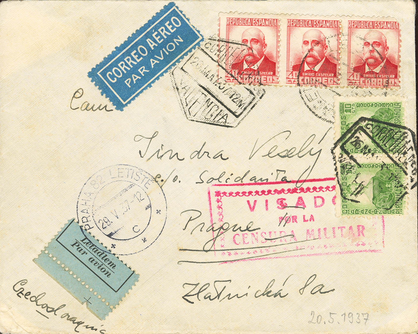 681(2), 736(3). 1937. 10 cts verde, dos sellos y 40 cts carmín, tres sellos. Brigadas Internacionales de ALBACETE a PRAGA (CHECOSLOVAQUIA). Matasellos ALBACETE / E.C.C. B.I. y CORREO AEREO / VALENCIA y en el frente marca de censura y llegada. MAGNIFICA Y RARA, ESPECTACULAR.