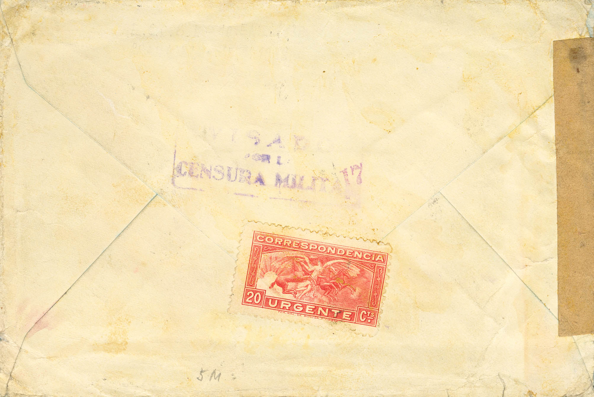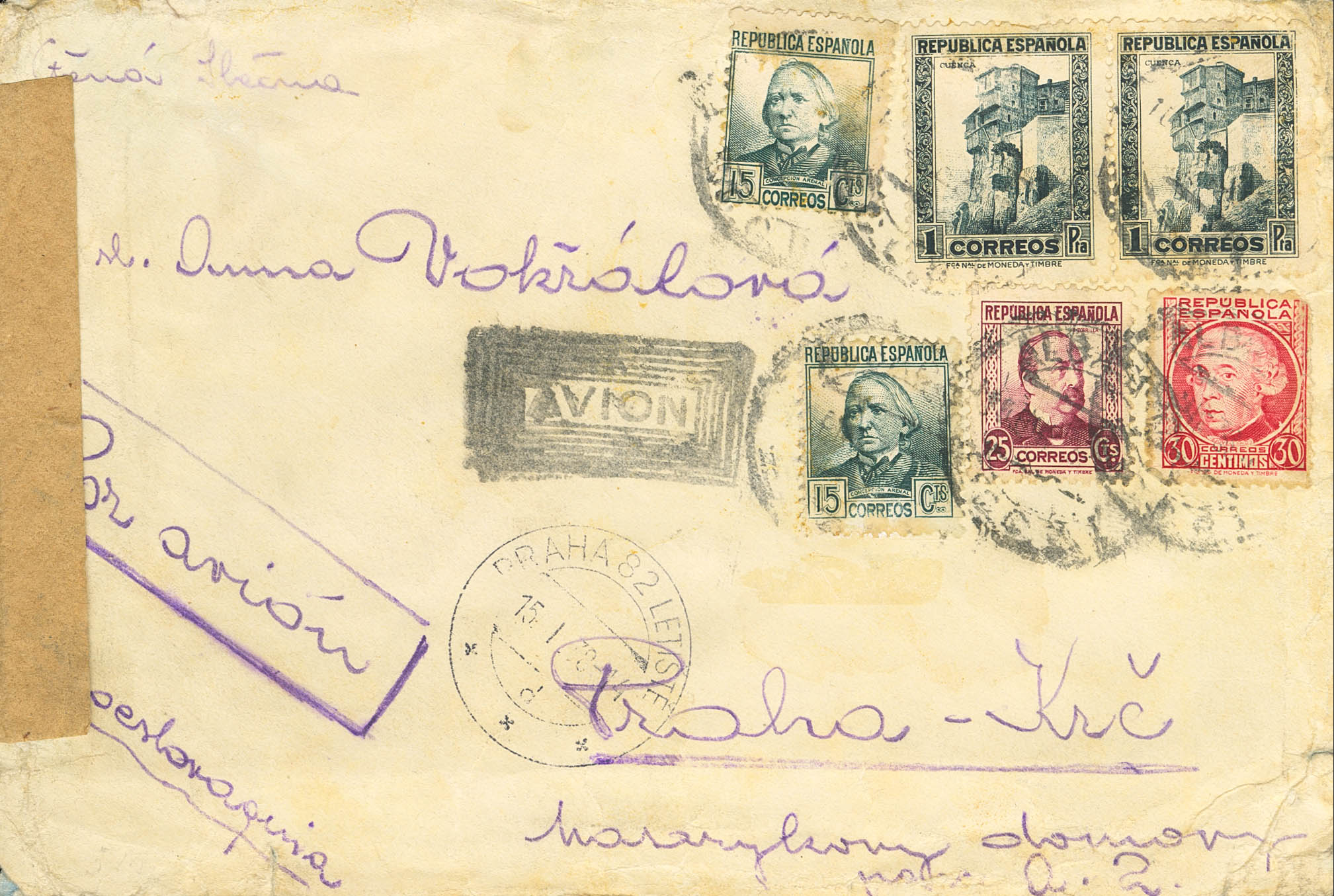 683(2), 685, 687, 673(2). 1938. 15 cts gris verde, dos sellos, 25 cts carmín, 30 cts carmín rojo y 1 pts negro, dos sellos. Brigadas Internacionales de ALBACETE a PRAGA (CHECOSLOVAQUIA). Matasello ALBACETE / E.C.C. B.I. y al dorso sello urgente de 25 cts sin matasellar. BONITA.