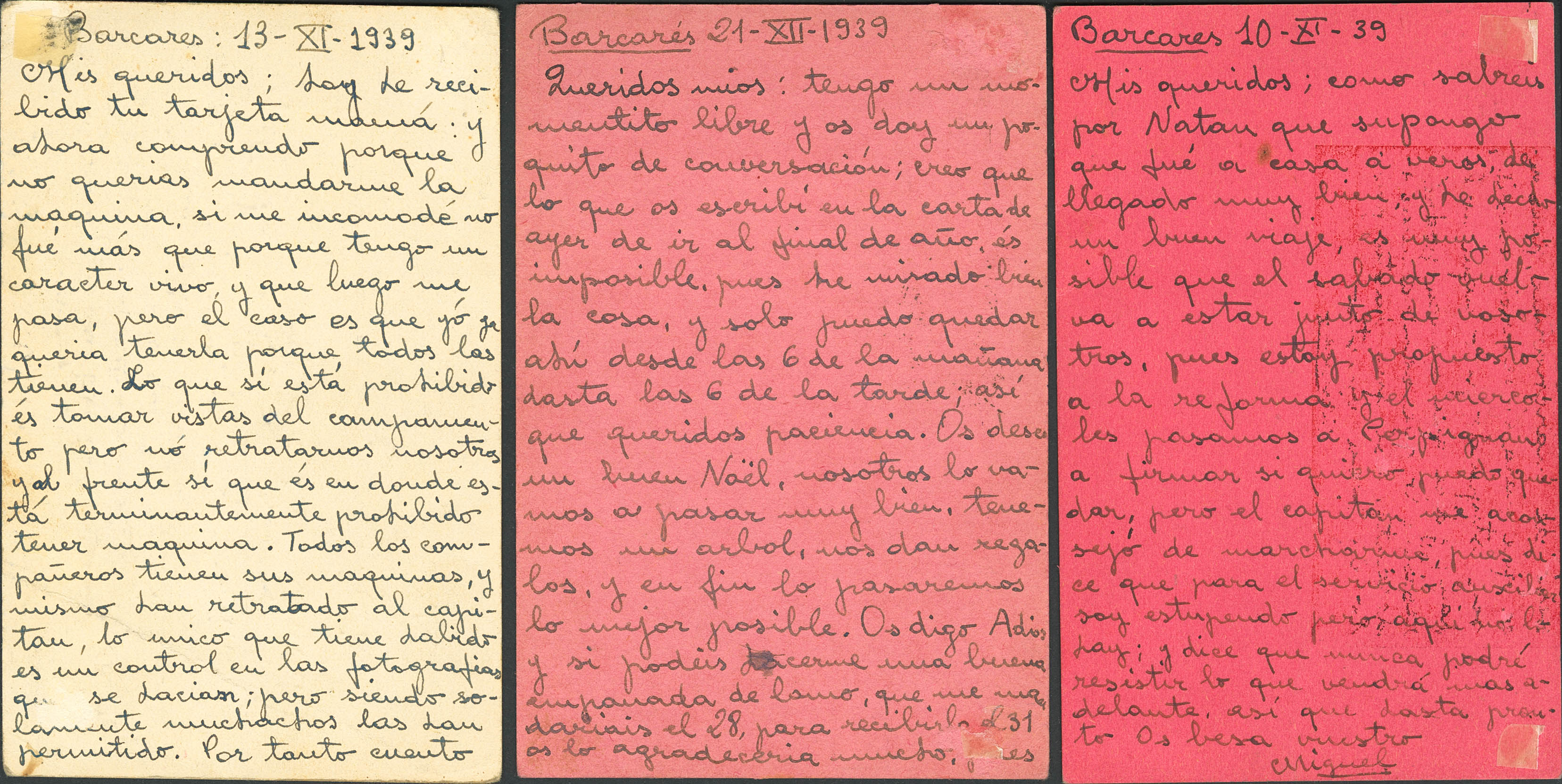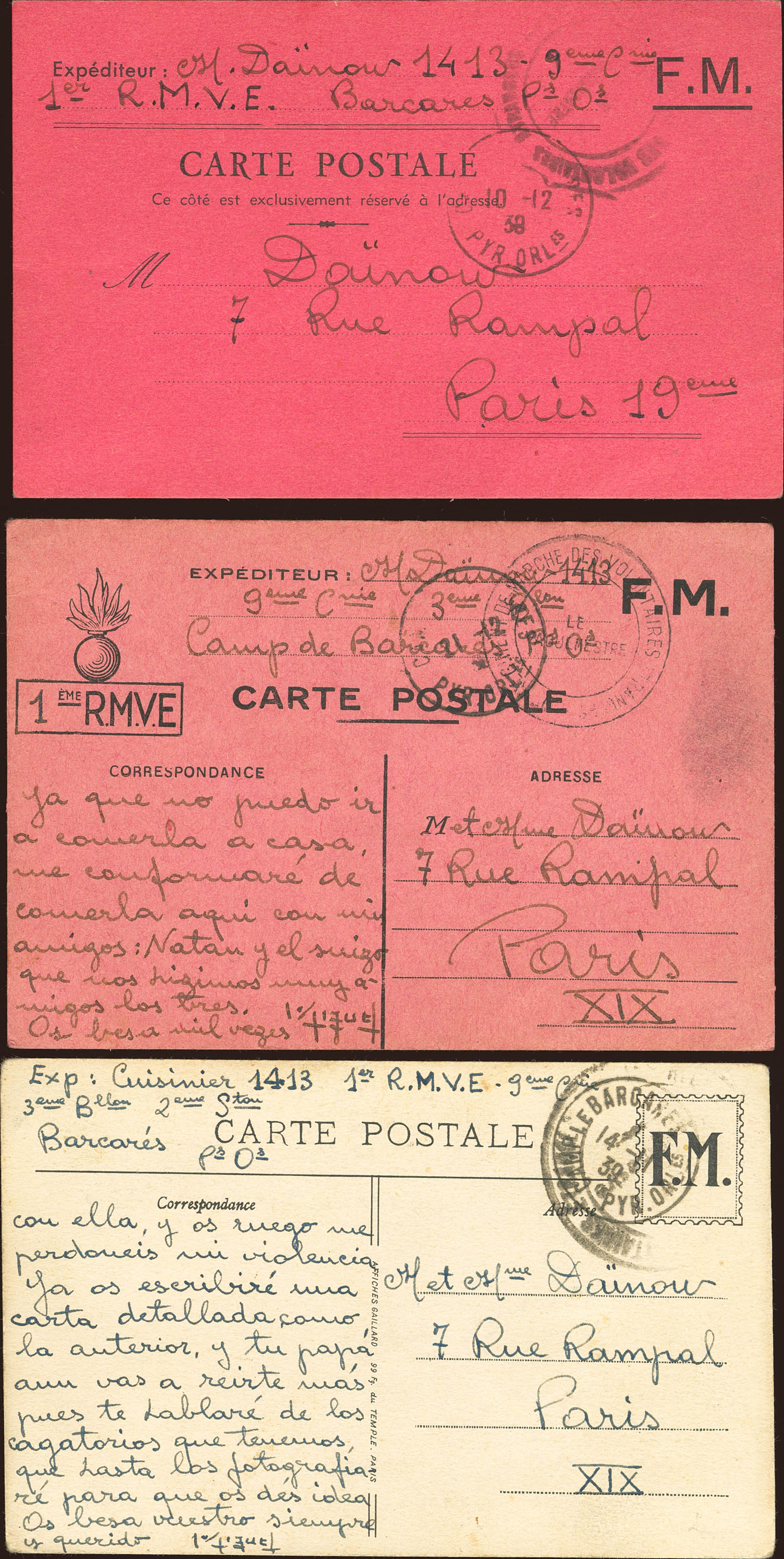1939. Tres tarjetas postales francesas de Franquicia Militar de BARCARES a PARIS (FRANCIA), remitidas por un soldado republicano español alistado en el Regimiento de Marcha Nº1 de Voluntarios Extranjeros (1EME RMVE), este y otros regimientos se crearon entre Octubre de 1939 y Mayo de 1940, en el seno de la Legión Extranjera, en Barcares, reclutando a numerosos republicanos españoles, muchos procedentes de Grupos de Trabajadores. Marca REGIMENT DE MARCHE DES VOLONTAIRES ETRANGERS / LE VAGUEMESTRE, en negro. MAGNIFICAS Y EXTRAORDINARIAMENTE RARAS.