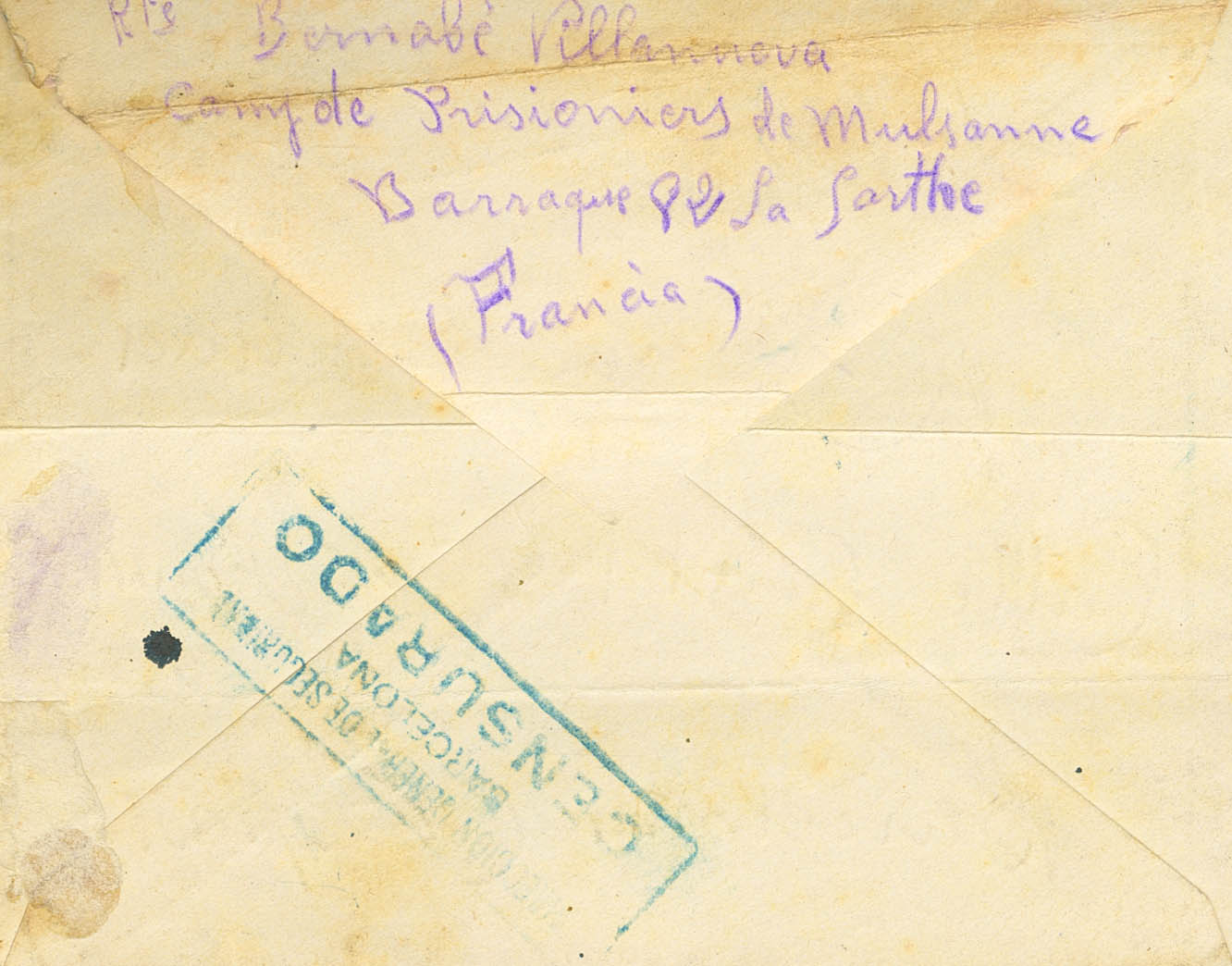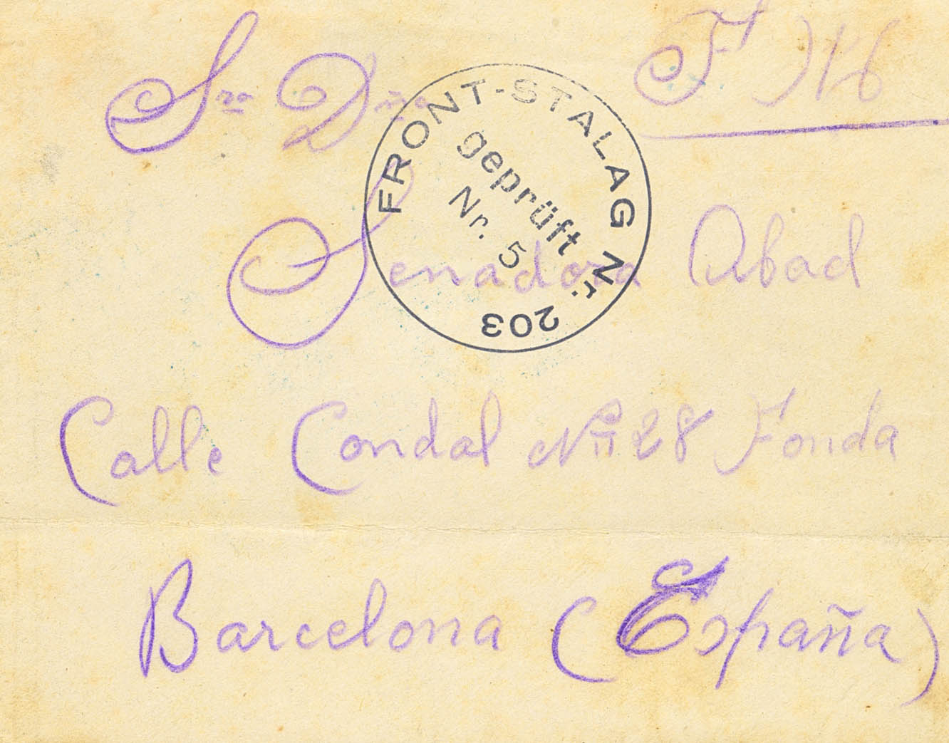 (1940ca). MULSANNE (FRANCIA) a BARCELONA, remitida por un prisionero español desde el Campo de Prisioneros de Mulsanne (La Sarthe) que estuvo en funcionamiento entre Julio de 1940 y Marzo de 1941. Los "Front stalag" eran campos alemanes abiertos en territorio francés y cerca del frente. Marca FRONT-STALAG NR.203 / GEPRÜFT / NR.5. MAGNIFICA Y RARISIMA, ESPECIALMENTE CON MARCA DE ORIGEN.