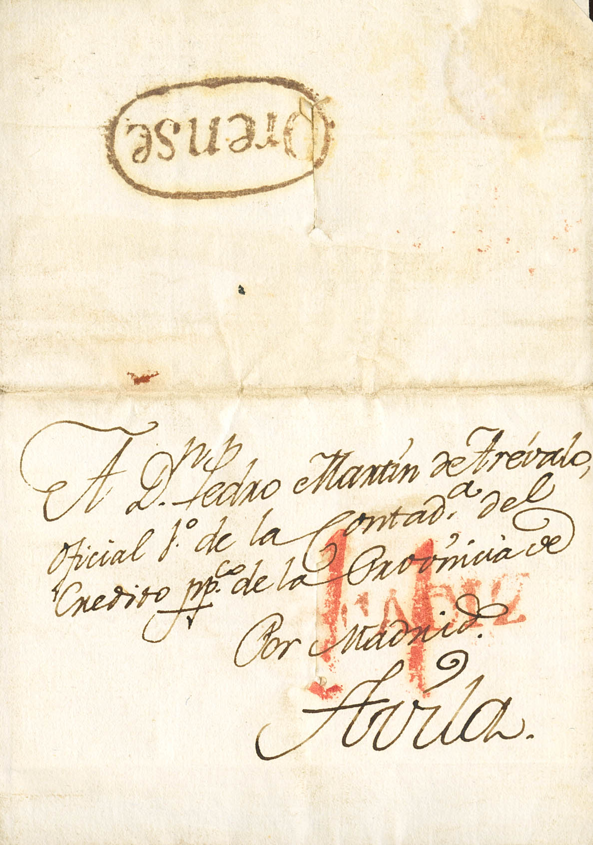 1820. CADIZ a AVILA, enviada por error a Orense (probablemente a una población también llamada Avila en Galicia o se depositó en las sacas que iban hacia Galicia). Marcas CADIZ, en rojo y al dorso marca ORENSE, aplicada en tránsito (P.E.11) edición 2004. MAGNIFICA Y MUY RARA.