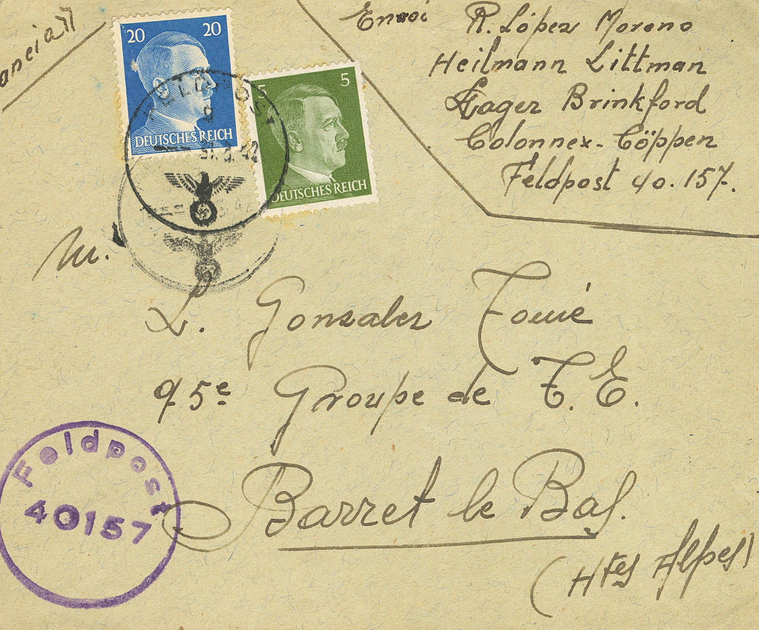 1942. 5 p verde y 20 p azul de Alemania. FELDPOST Nº40157 (asignado a la Compañía de Trabajadores Jakob, que trabajaban para una contrata del ejército alemán con la empresa Heilmann Littman) a BARRET LE BAS (FRANCIA), remitida por un prisionero alemán ingresado en esta compañía y dirigida a un refugiado español del 75 Groupe des Travarlleurs Espagnols. En el frente datos del remitente y marca FELDPOST / 40157, en violeta. MAGNIFICA Y RARISIMA CIRCULADA ENTRE DIFERENTES CAMPOS, ESPECIALMENTE CON ORIGEN EN UN CAMPO ALEMAN.