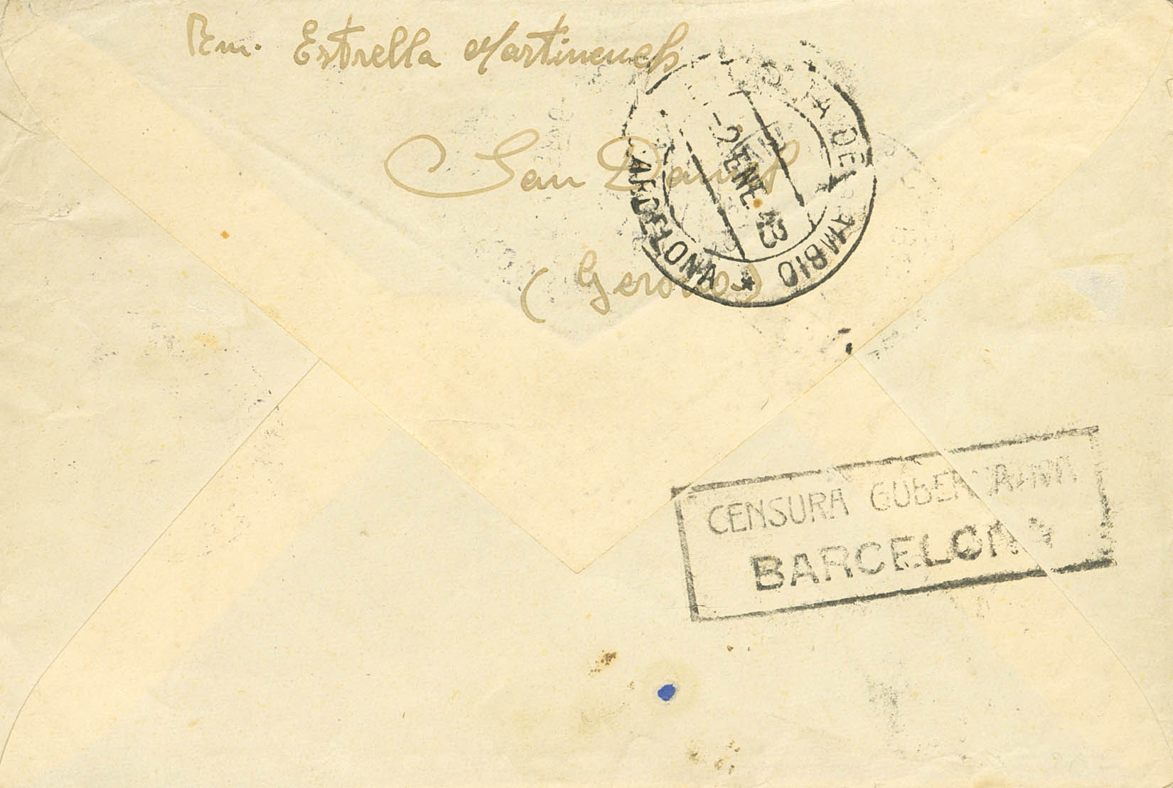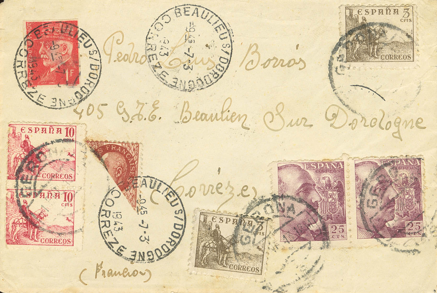 1943. 25 cts lila, 5 cts castaño y 10 cts carmín, dos sellos de cada. GERONA a BEAULIEU SUR DORDOGNE (FRANCIA), dirigida a un español internado en el 405 Groupe des Travailleurs Espagnols (G.T.E.). A la llegada (varios meses después) se aplican sellos de Francia de 1 f rojo y 1´50 f castaño bisectado, para completar el franqueo. MAGNIFICA Y RARA.