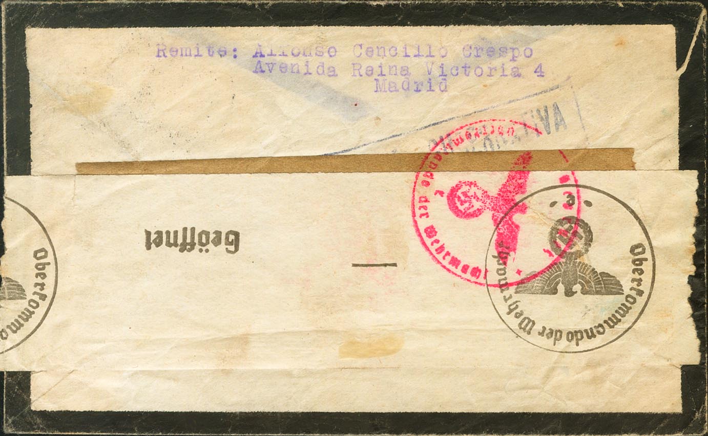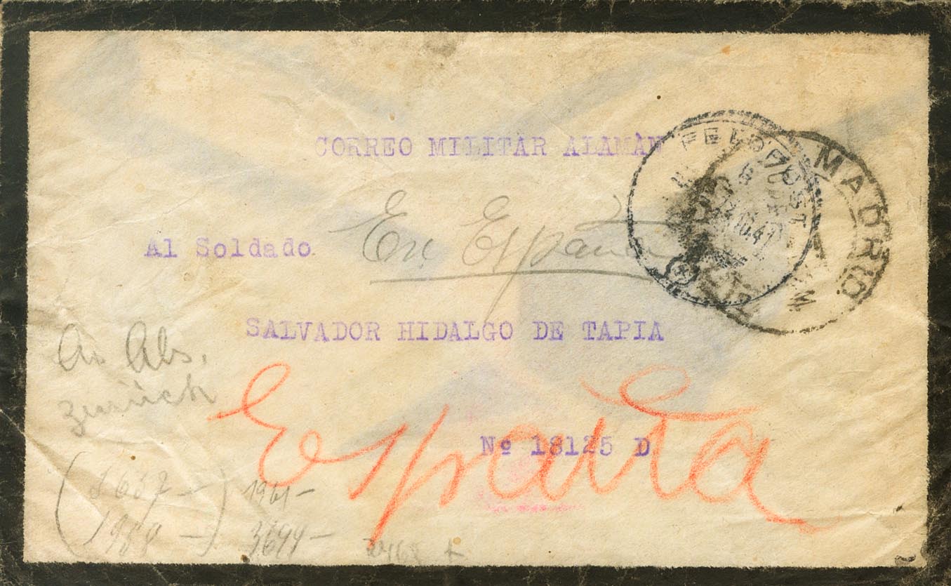1941. FRENTE DE NOWGOROD (23 de Septiembre). MADRID a FELDPOST Nº18125-D (Regimiento de Infantería 269, 3ª Compañía). Fechador FELDPOST / B y números de los censores a lápiz, al dorso marcas y banda de censura. MAGNIFICA Y RARA.