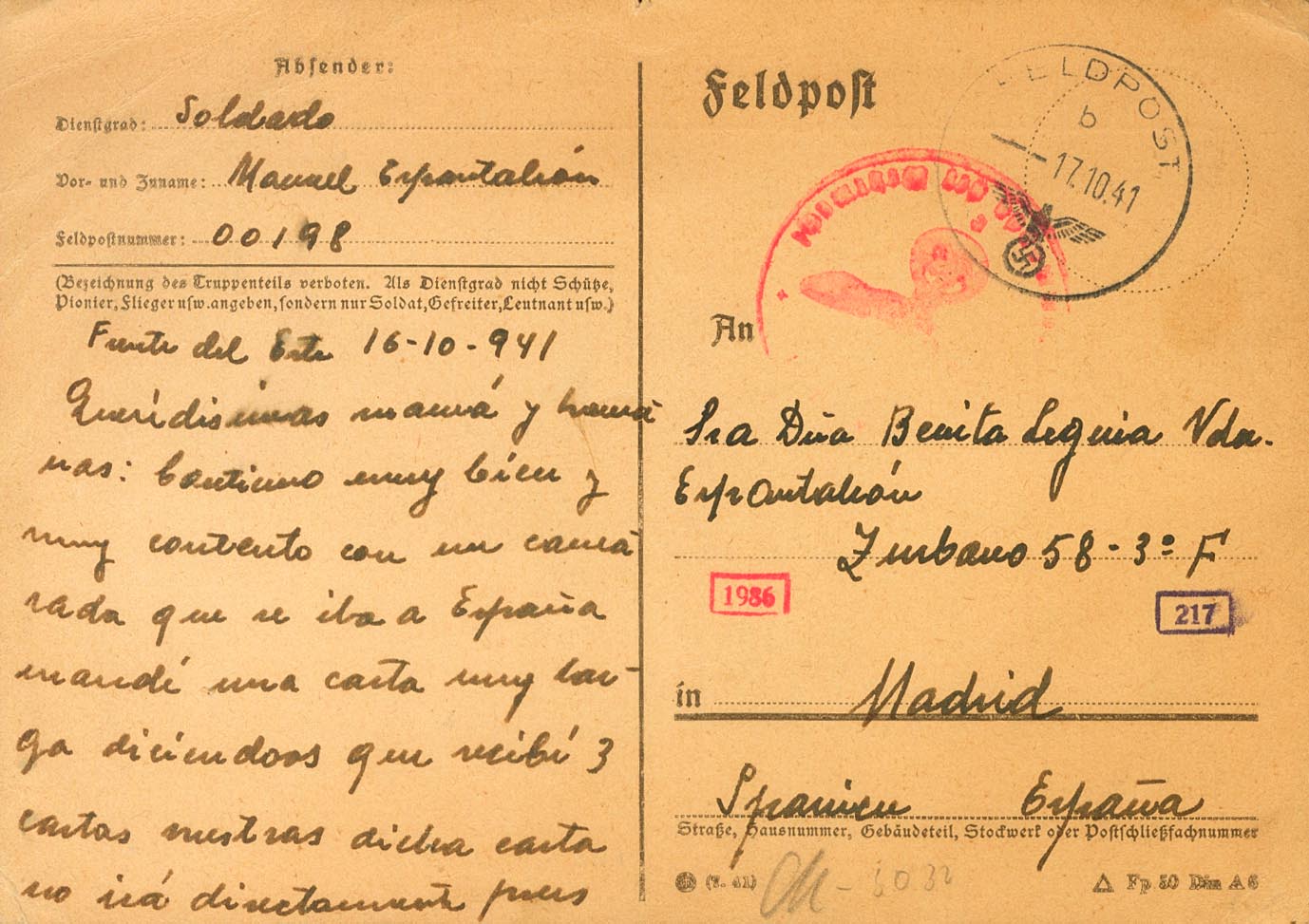 1941. FRENTE DE NOWGOROD (16 de Octubre). Tarjeta Postal FELDPOST Nº00198 (Jefatura de División) a MADRID. Fechador FELDPOST / B y marcas de censura, en rojo y de los censores, en rojo y violeta. MAGNIFICA Y RARA.