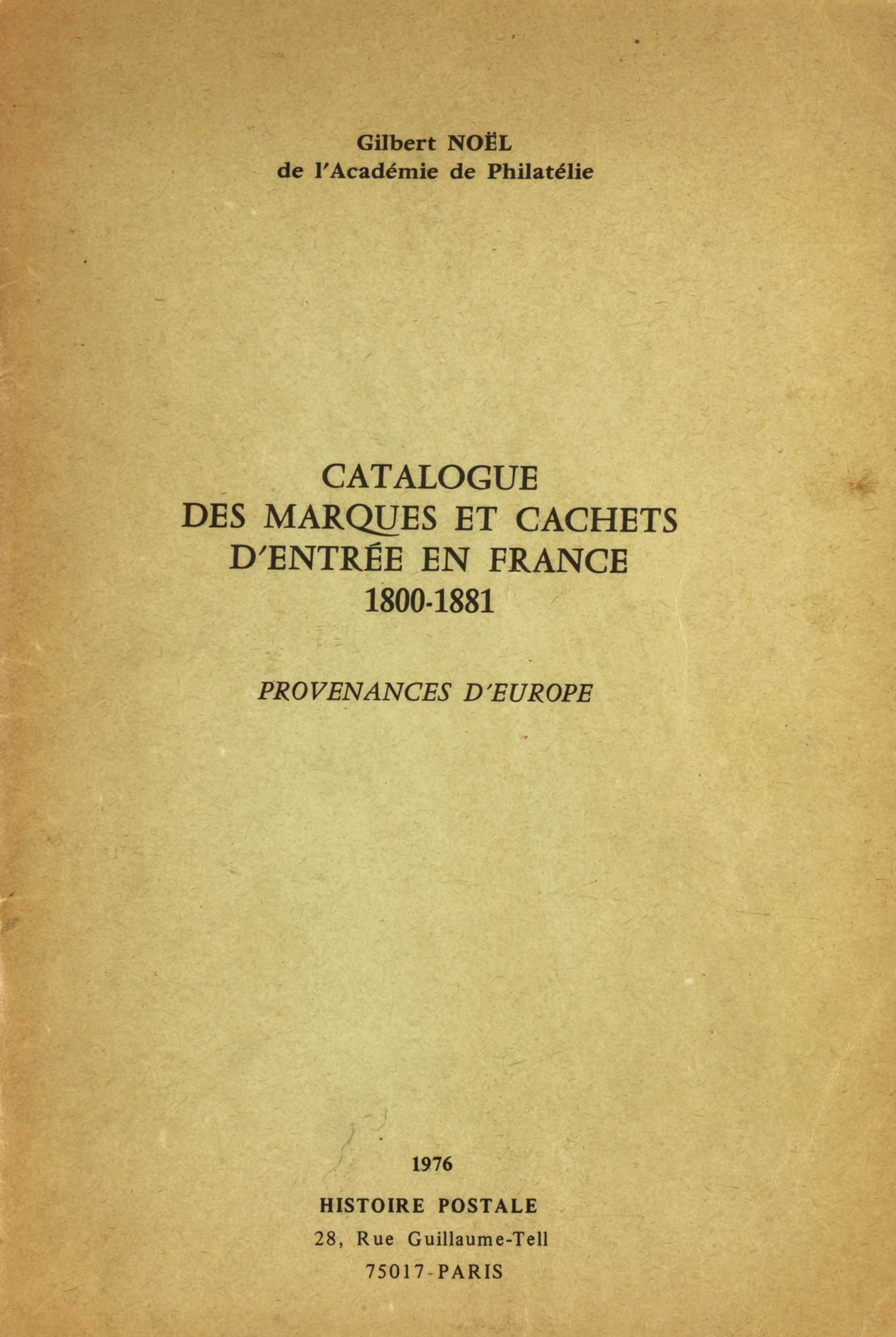 1976. CATALOGUE DES MARQUES ET CACHETS D´ENTREE EN FRANCE 1800-1881 PROVENANCES D´EUROPE. Gilbert Nöel, 1976).
