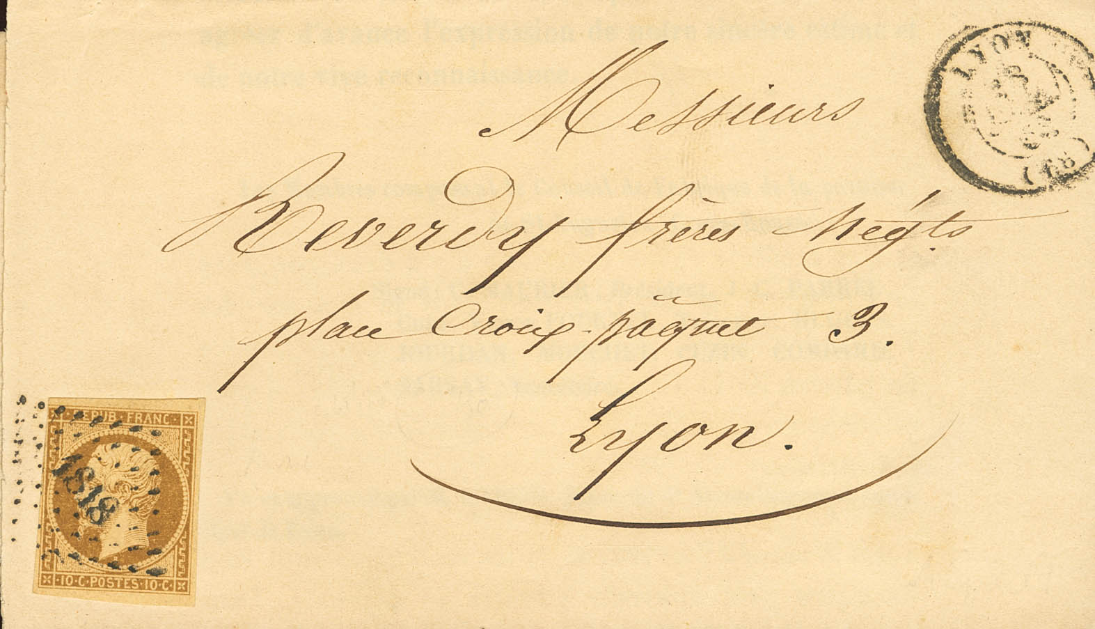9. 1853. 10 cts castaño amarillo (un margen justo). Impreso Correo Interior de LYON. BONITA. Edifil 2014: 1.100 Euros
