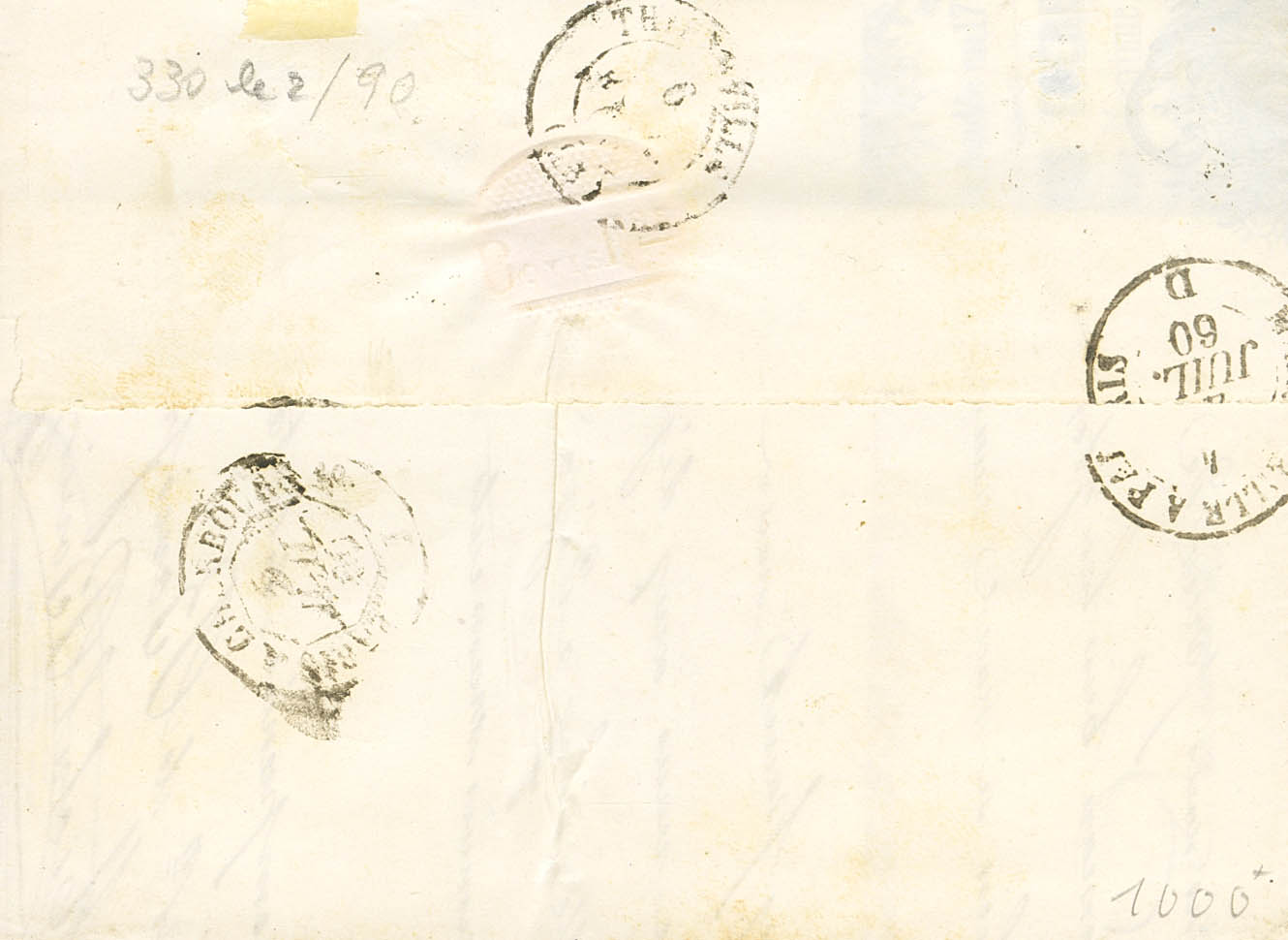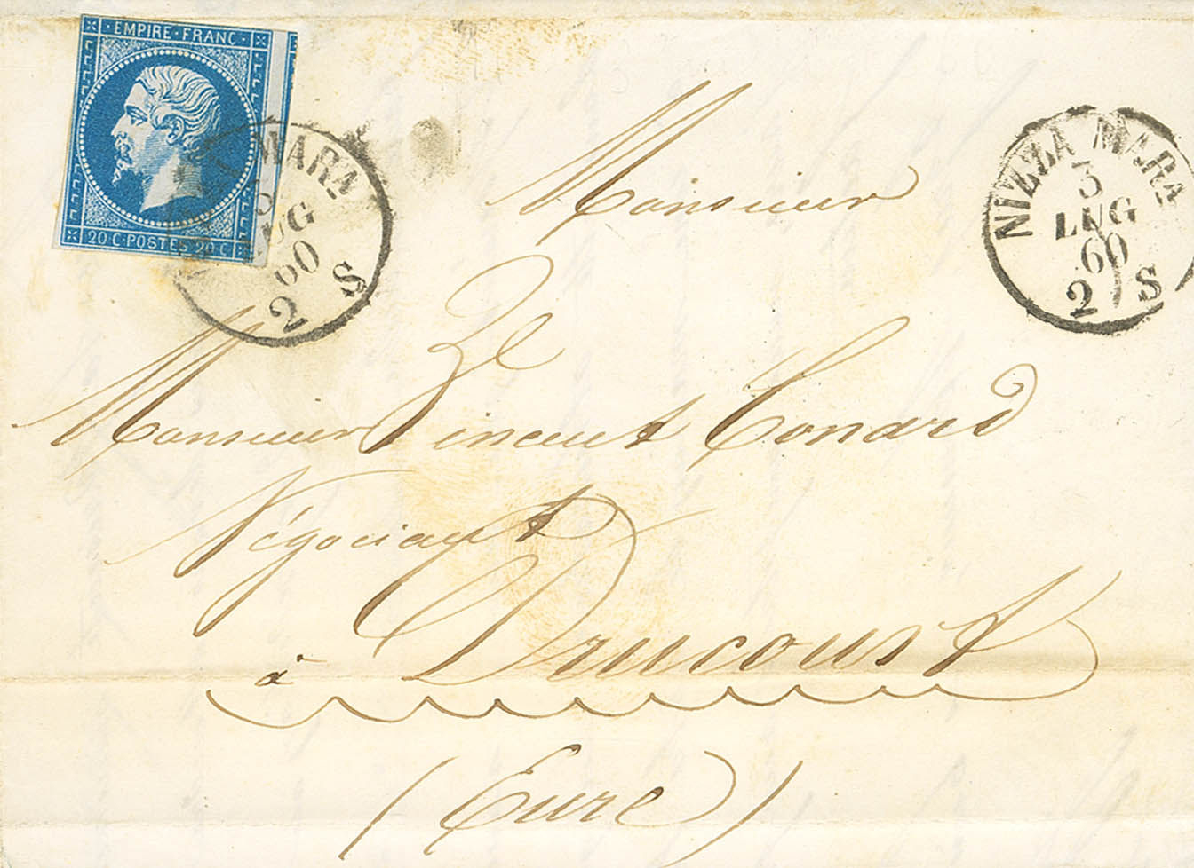 Yvert 14A. 1860. 20 cts azul. NIZA a DRUCOURT. Matasello NIZZA MARA. BONITA Y RARO USO DURANTE EL PERIODO DEL CONDADO DE NIZA (COMTE DE NICE).