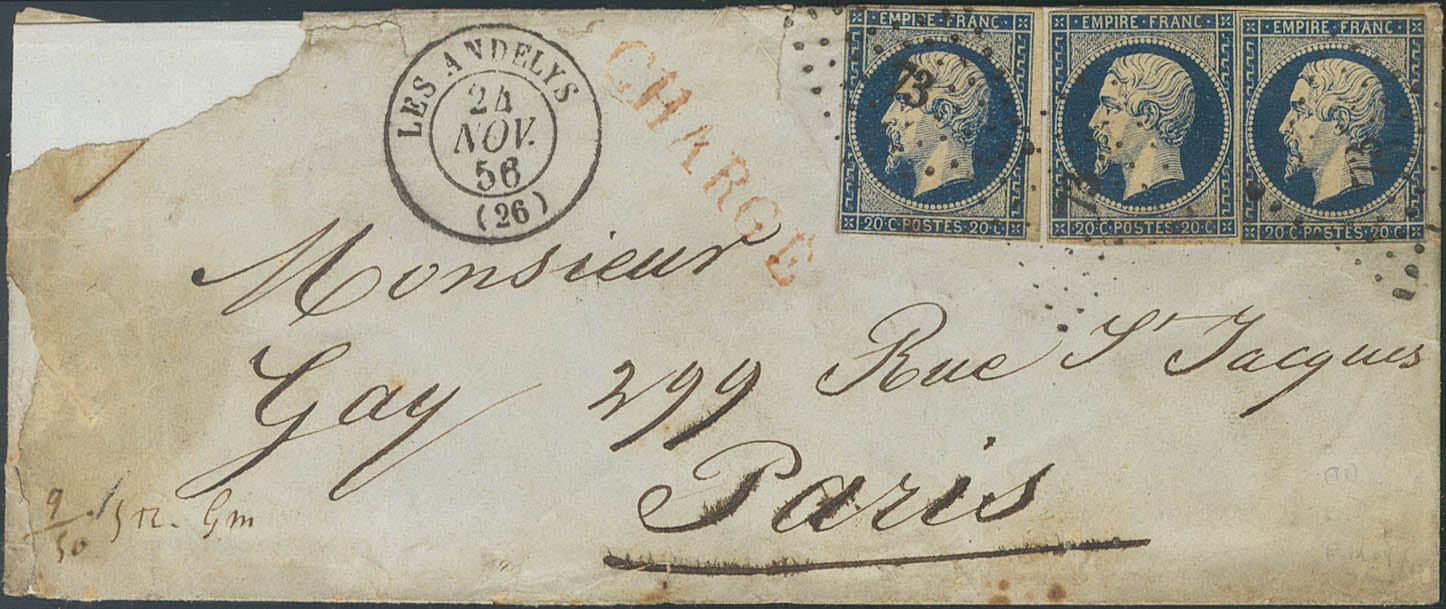 Yvert 14A(3). 1856. 20 cts azul, tres sellos (un sello margen justo). Certificado de LES ANDELYS a PARIS (gran erosión en la parte izquierda del sobre). BONITA.