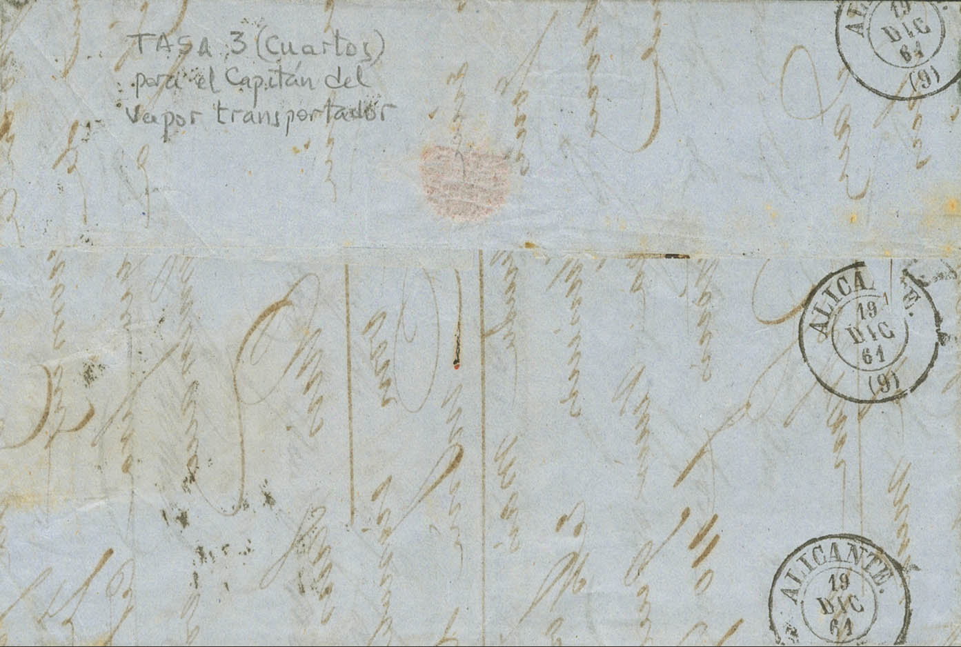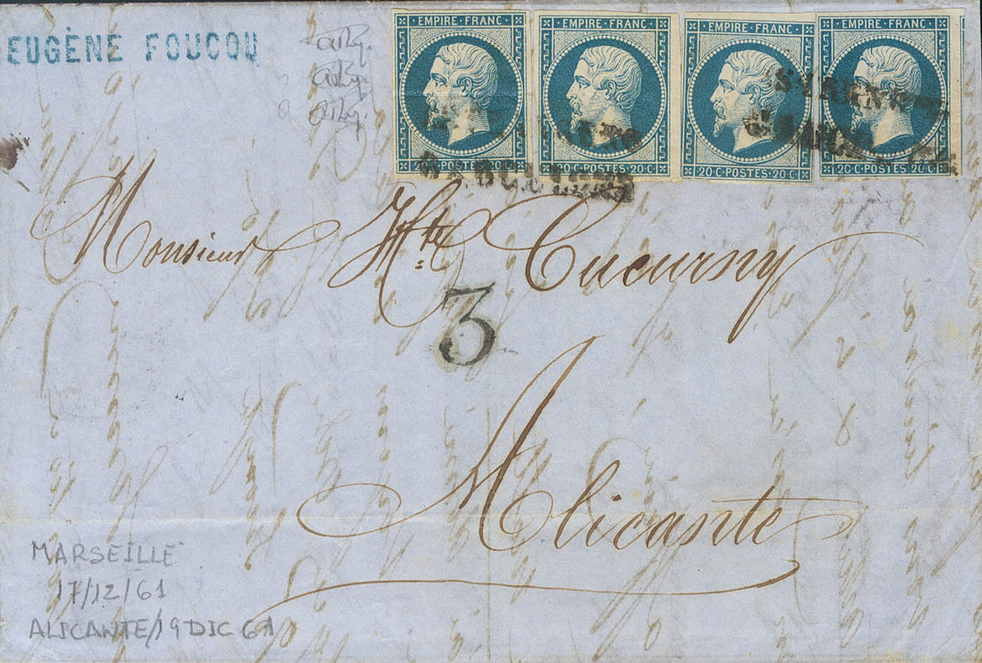 Yvert 14B(4). 1861. 20 cts azul, cuatro sellos (uno con doblez de origen). MARSELLA a ALICANTE. Matasello ESTRANGERO / BARCELONA, aplicado en tránsito. MAGNIFICA Y RARA.