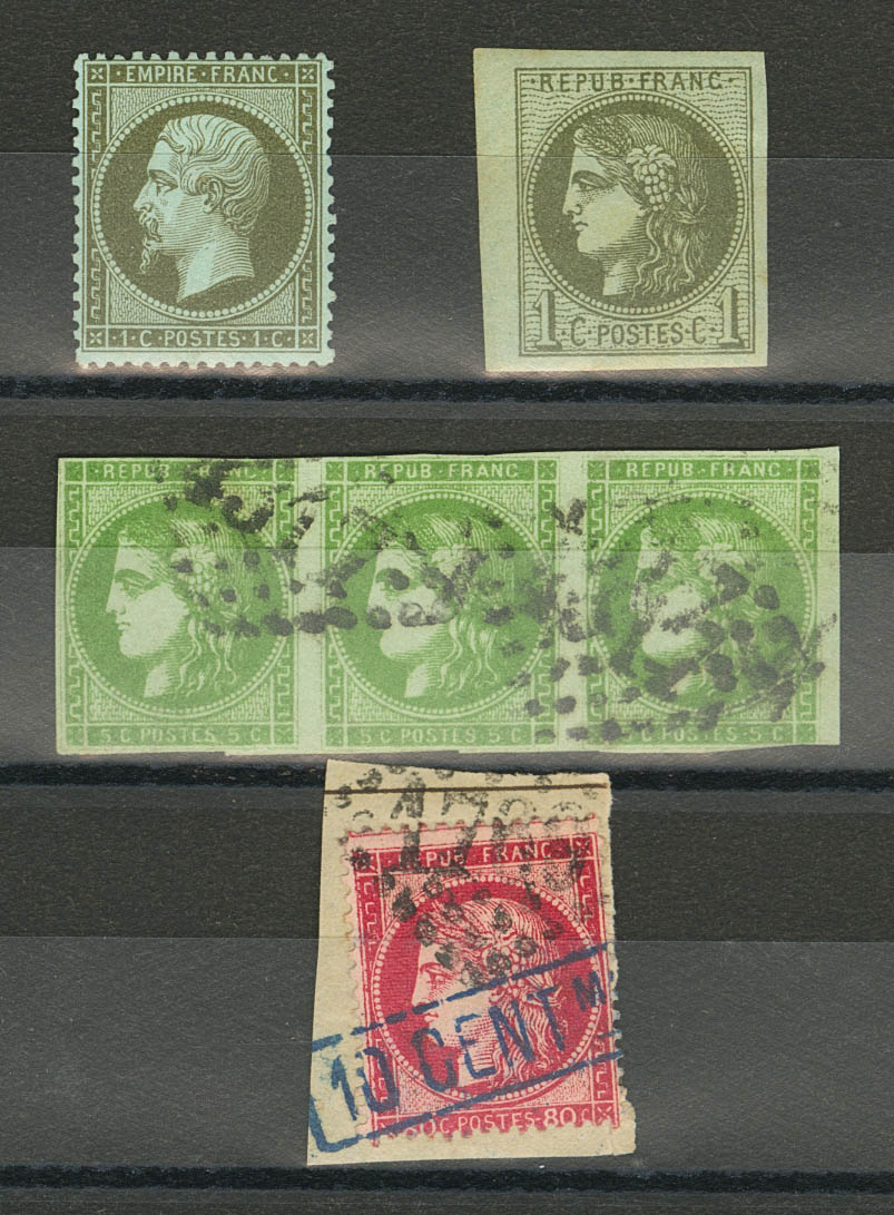 ★/Yvert 19, 39A, 42B(3), 57. 1862. Conjunto de dos sellos nuevos del 1 cts de 1862 y 1 cts (Reporte 1) de 1870 (Burdeos) y una tira de tres matasellada de 5 cts de 1870 y 80 cts carmín con matasello de tasa uruguayo (los sellos de 1 cts en perfecto estado). A EXAMINAR. Yvert 2024: +1.450 Euros