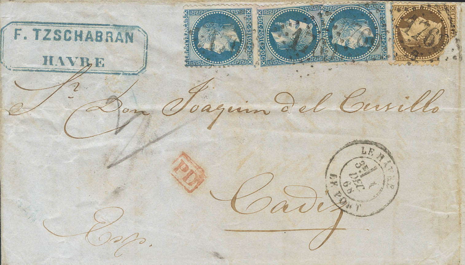 Yvert 29B(3), 30. 1861. 20 cts azul, tres sellos y 30 cts castaño (defecto en origen). LE HAVRE a CADIZ (en el interior conocimiento de embarque). BONITA E INUSUAL COMBINACION DE FRANQUEO PARA COMPLETAR LA TARIFA DE DOBLE PORTE A ESPAÑA.