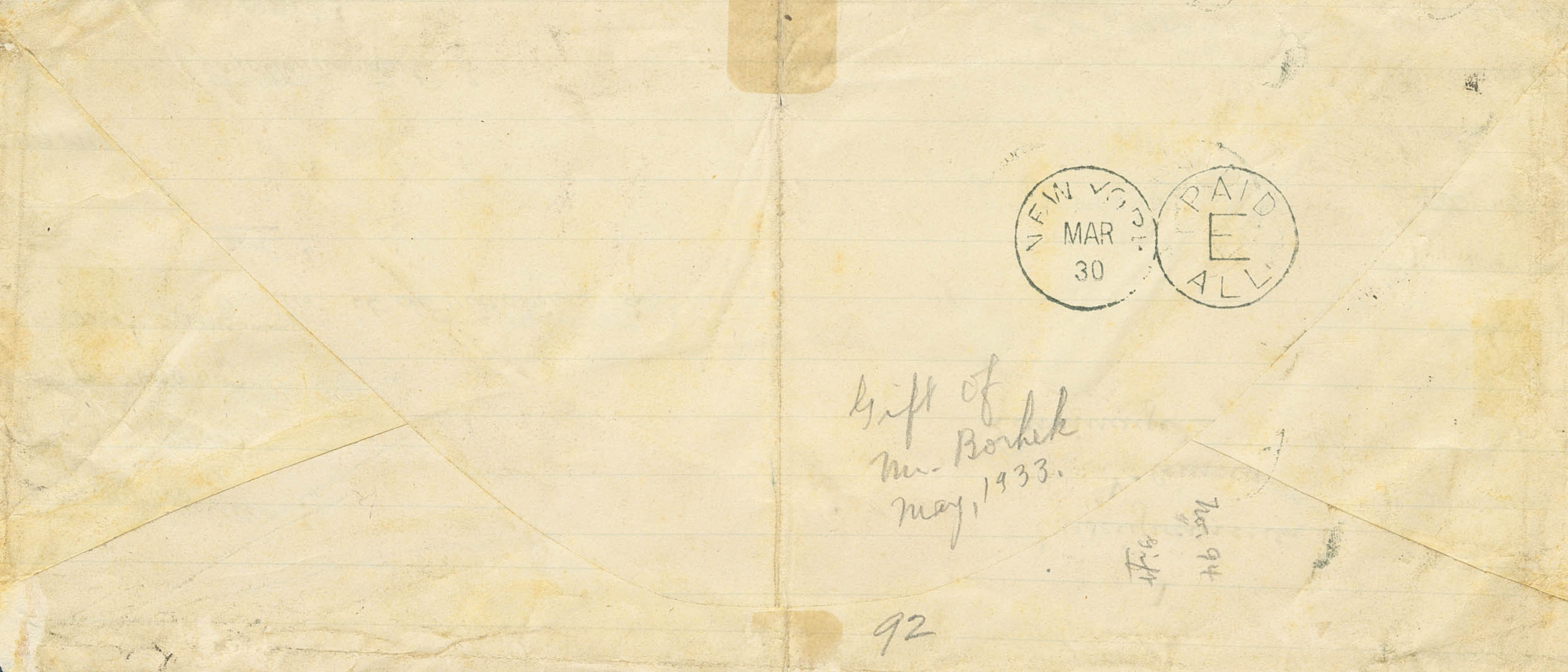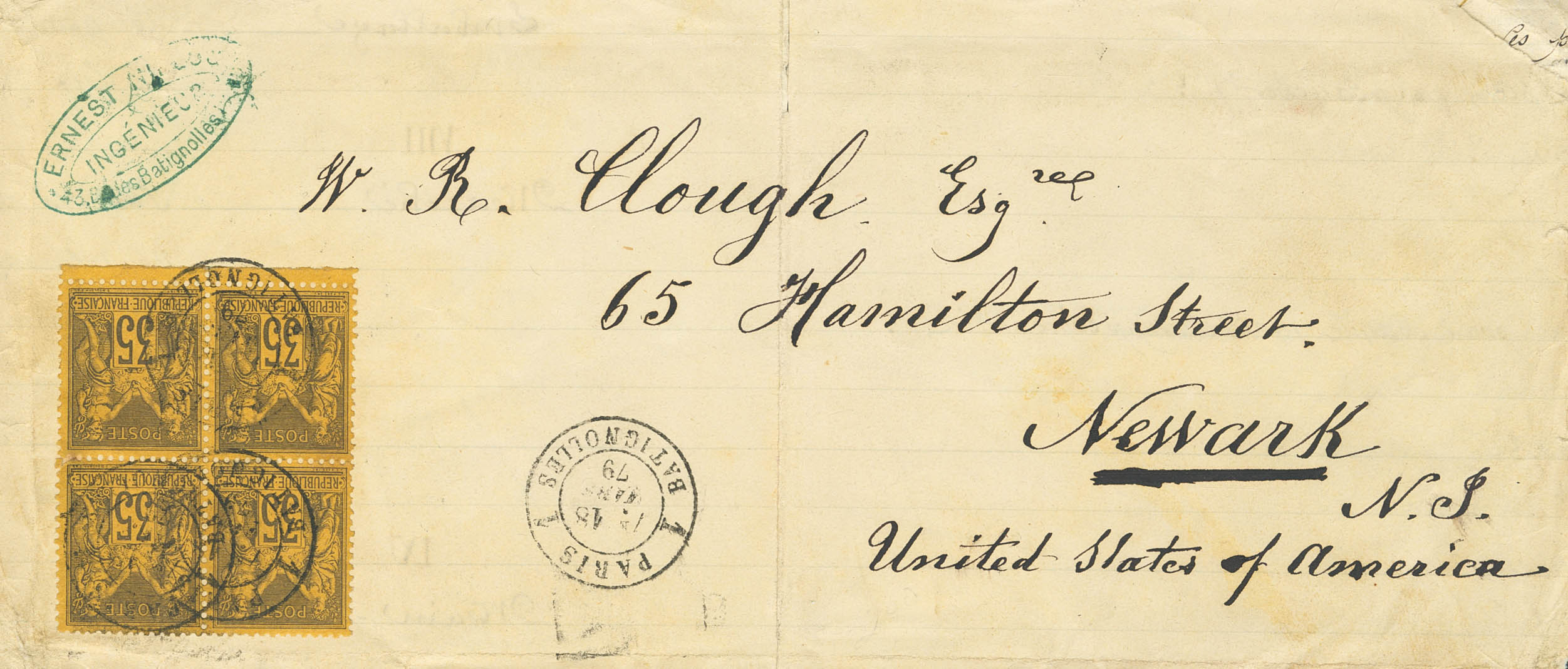 Yvert 93(4). 1879. 35 cts violeta gris sobre amarillo, bloque de cuatro. PARIS a NEWARK (U.S.A.). Matasello PARIS / BATIGNOLLES, al dorso llegada. BONITA Y MUY RARO EL 35 CTS EN BLOQUE SOBRE CARTA.