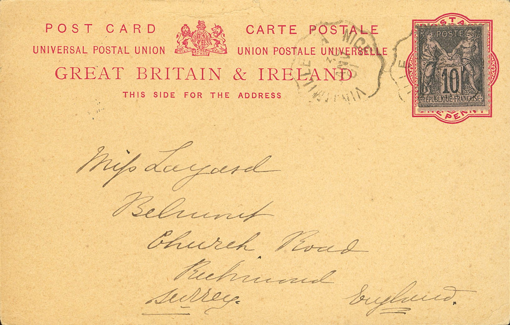Yvert 103. 1901. 10 cts negro sobre lila. Tarjeta Entero Postal de Gran Bretaña de 1 p rojo de MENTON a RICHMOND (GRAN BRETAÑA). Matasello ambulante VINTIMILLE A NICE, Tipo "Convoyeur". MAGNIFICA E INUSUAL UTILIZACION.