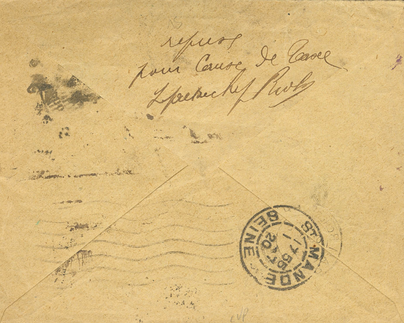 137. 1920. 5 cts verde. MARSELLA a SAINT MANDE. Devuelta al remitente y tasada doblemente a la llegada a Saint Mandé con sellos de tasa de 10 cts castaño y 30 cts rojo, tres sellos anulados a pluma y fechador y en el destino de devolución, Marsella, con dos sellos de tasas de 50 cts. MAGNIFICA.