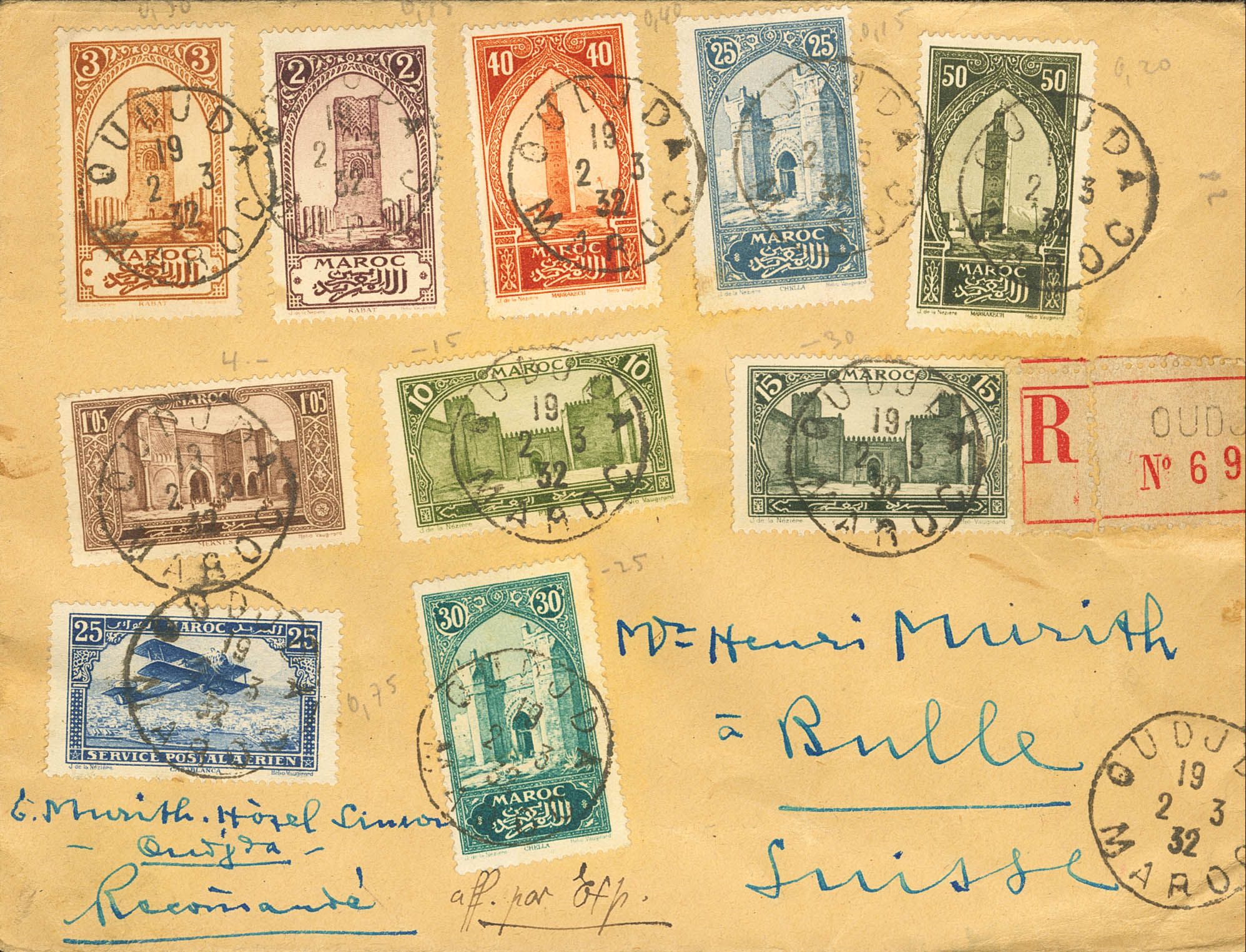 Yvert 99/03,105/06,108, Aéreos 2,5. 1932. Diversos valores y aéreos de 25 cts azul y 75 cts verde oscuro (en anverso y reverso). Certificado de OUDJDA a BULLE (SUIZA). MAGNIFICA.