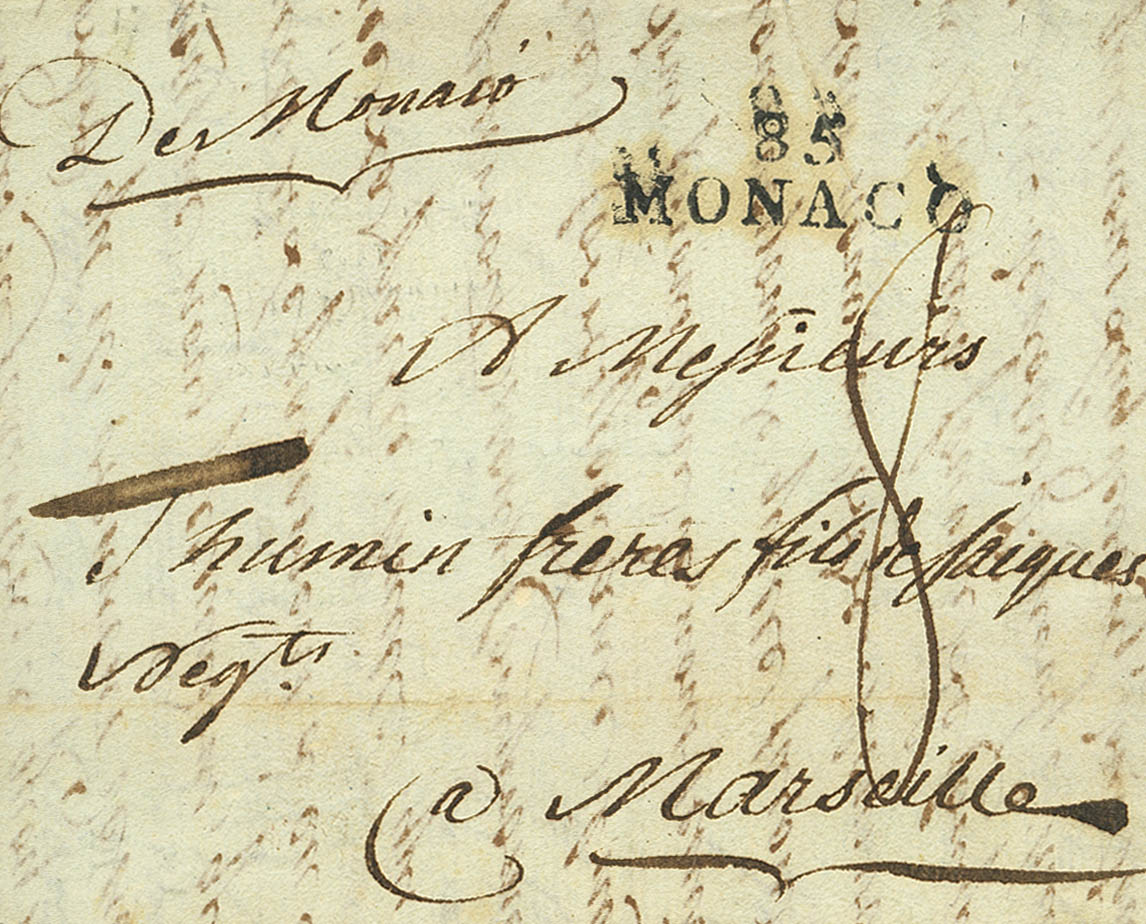 1797. PORT MAURICE (CERDEÑA) a MARSELLA. Marca 85 / MONACO, en negro y manuscrito "De Monaco", aplicados en tránsito. MAGNIFICA Y MUY RARA.