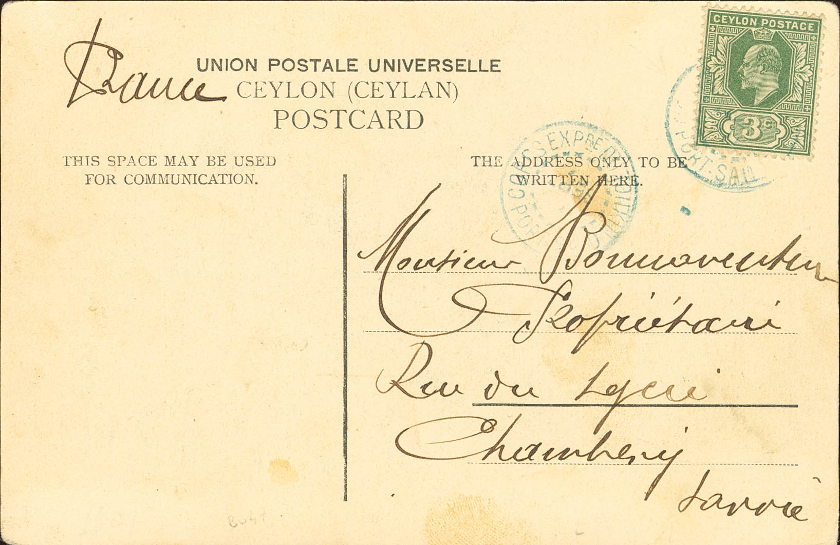 Yvert 144. (1903ca). 3 cts verde. Dirigida a CHAMBERY (FRANCIA). Matasello CORPS EXPRE.DU TONKIN / PORT SAID, en azul. MAGNIFICA Y RARA COMBINACION CON MATASELLO MILITAR FRANCES.