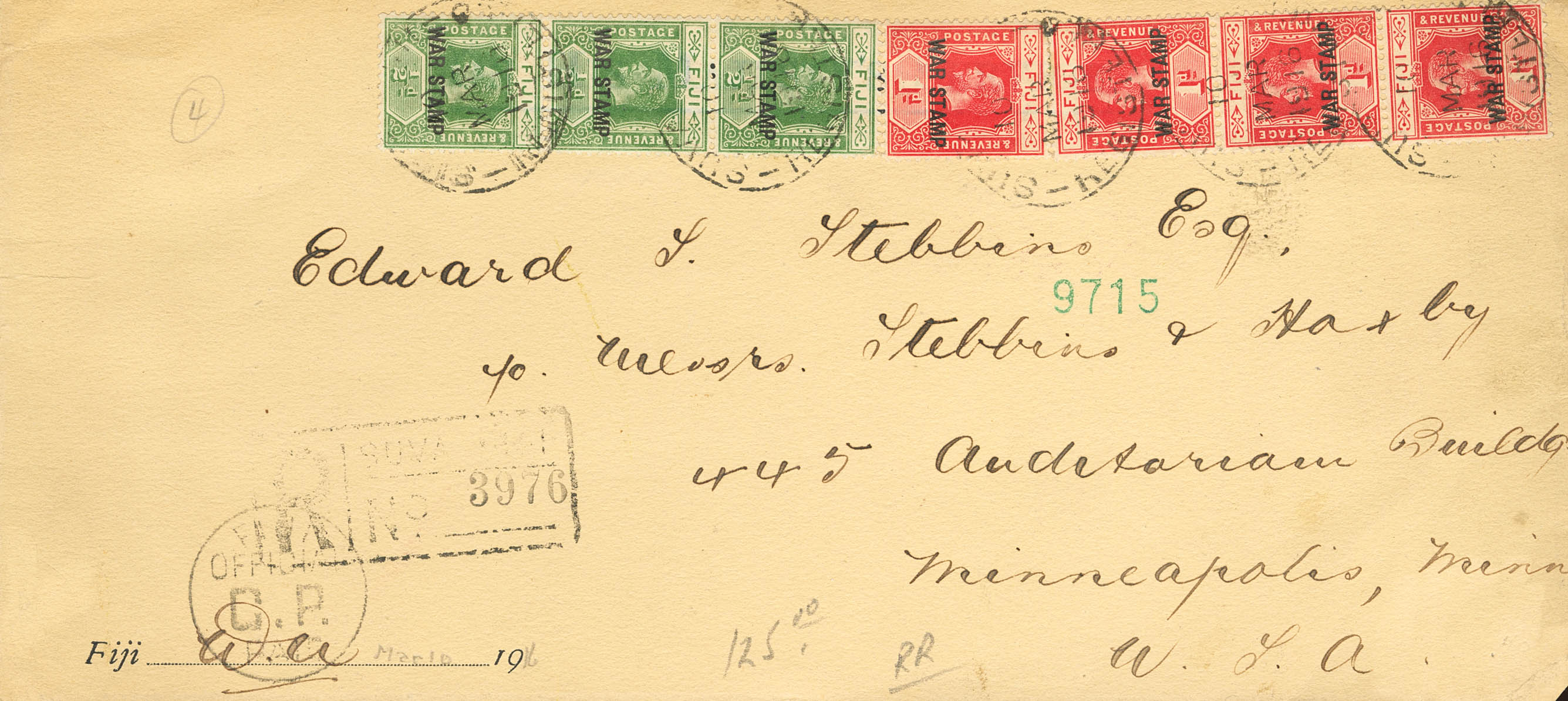 Yvert 81(3), 82(4). 1916. ½ p verde, tres sellos y 1 p rojo, cuatro sellos. Certificado de SUVA a MINNEAPOLIS (U.S.A.). Al dorso tránsito SEATTLE y llegada. MAGNIFICA Y RARA.