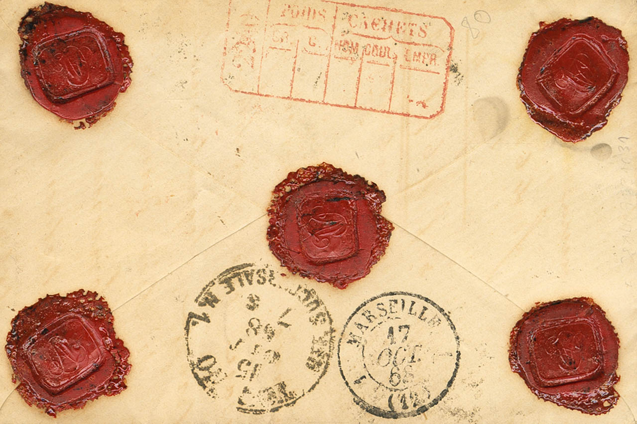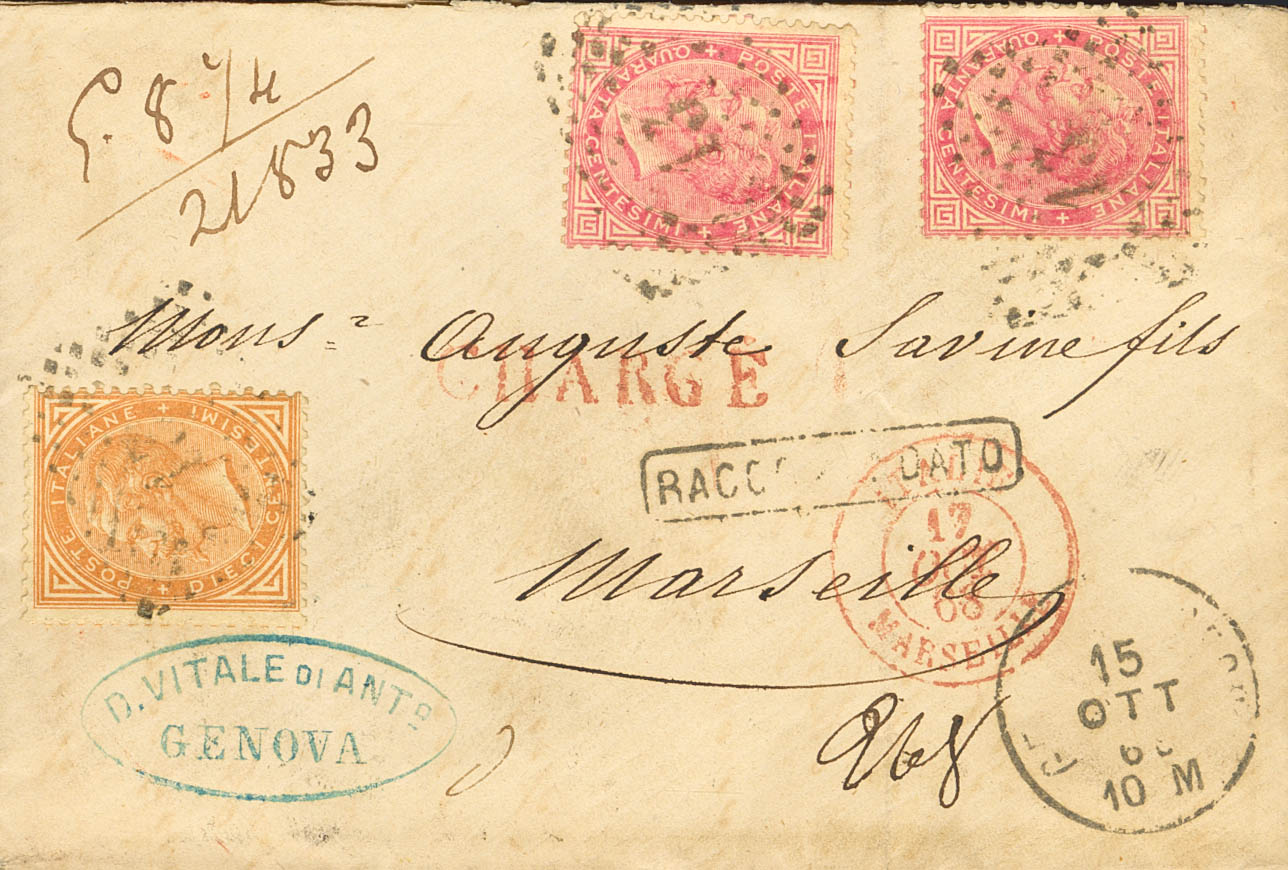 Yvert 15, 19(2). 1868. 10 cts naranja y 40 cts rosa, dos sellos (ambos tirada de Torino). Certificado de GENOVA a MARSELLA (FRANCIA). Matasello numeral "13" y en el frente marcas CHARGE, en rojo y RACCOMANDATO, en negro y al dorso marca francesa de medidas y llegada. MAGNIFICA. (Sassone T17, T20)