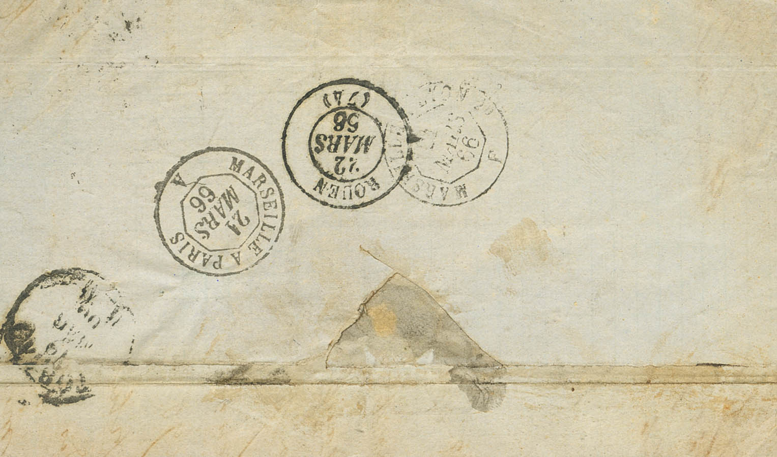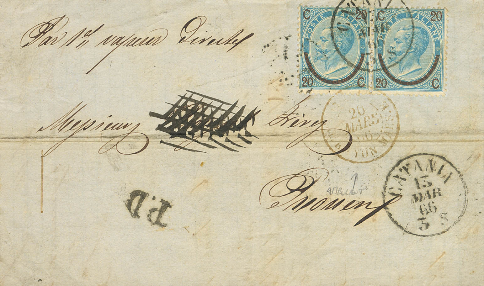 Yvert 22a(2). 1866. 20 cts sobre 15 cts azul (Tipo II), pareja. CATANIA a ROUEN (FRANCIA). Matasello CATANIA y ambulante francés. MAGNIFICA. (Sassone 24)