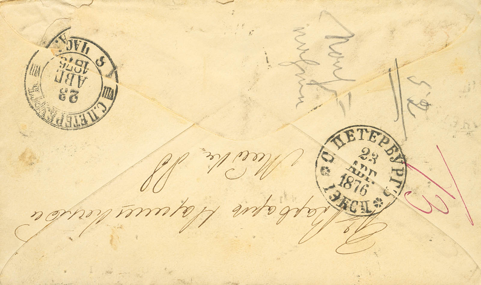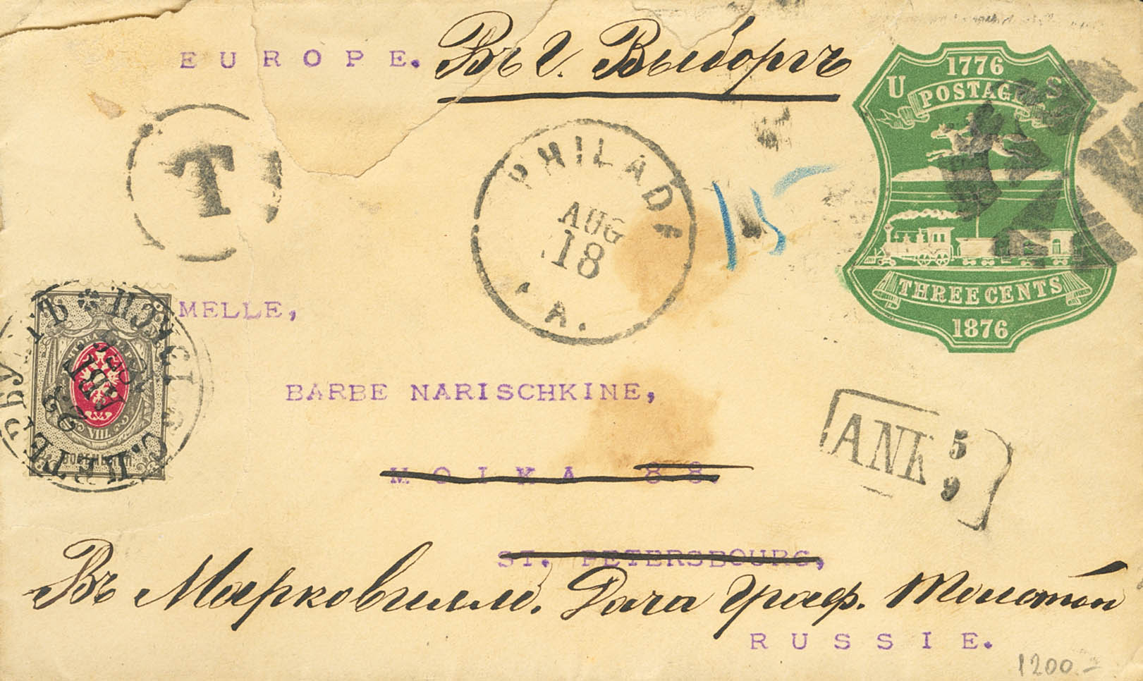 Yvert 25. 1876. 3 ctvos verde sobre Entero Postal de Estados Unidos de FILADELFIA a SAN PETERSBURGO, reexpedida internamente aplicando sello de 8 k gris y carmín con matasello de San Petersburgo. En el frente marca de tasa (leves defectos por apertura sin importancia). BONITA Y RARISIMO FRANQUEO DE CORREO ENTRANTE REDIRIGIDO AL INTERIOR.