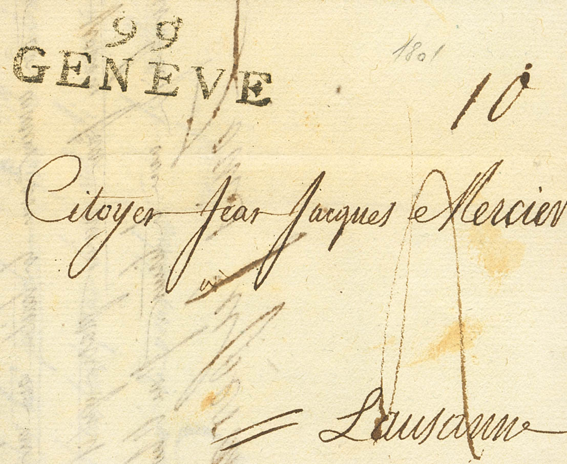 1801. GINEBRA a LAUSANA, circulada durante el periodo de anexión de Ginebra a Francia. Marca 99 / GENEVE y porteo "10" manuscrito. MAGNIFICA.