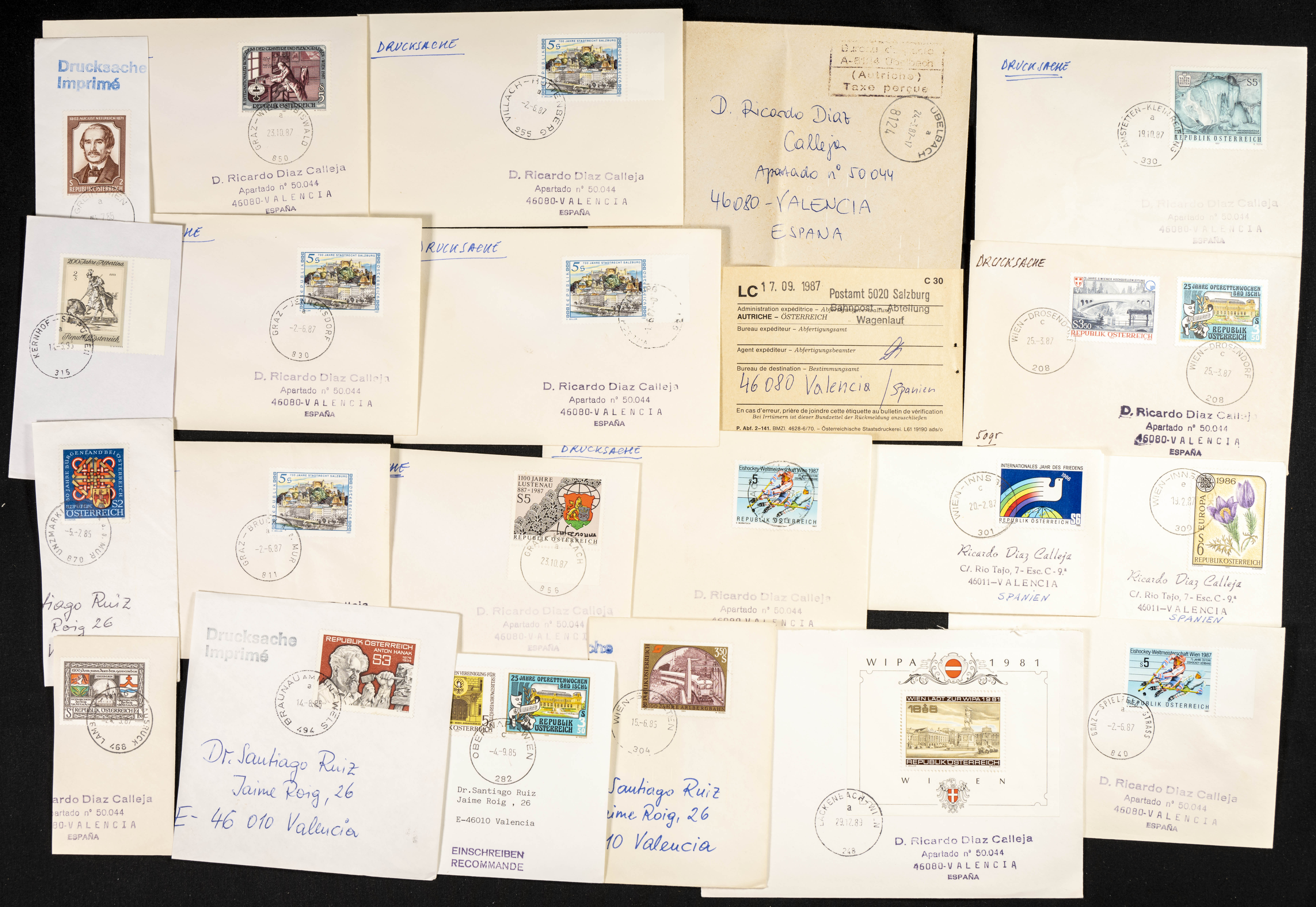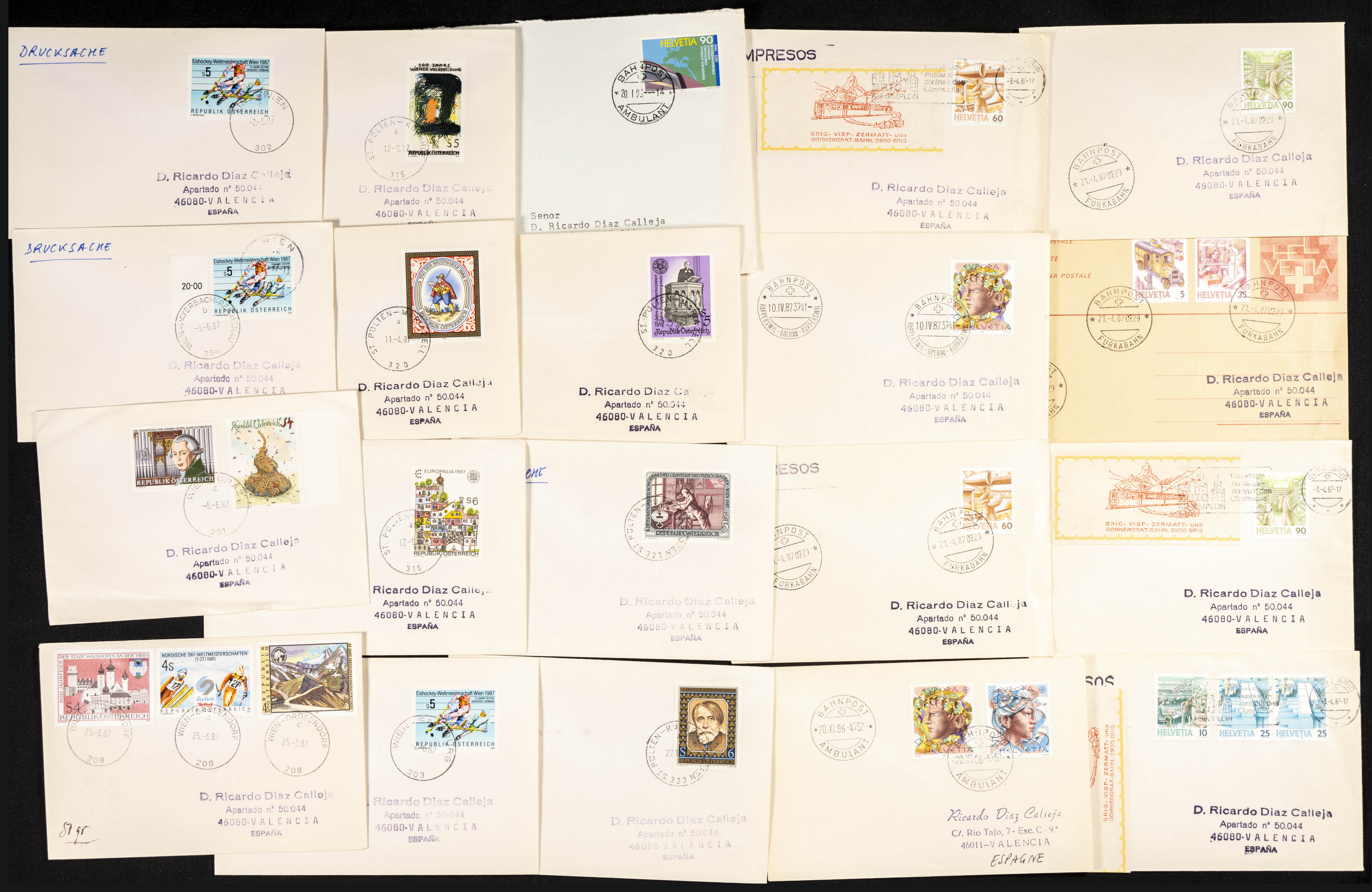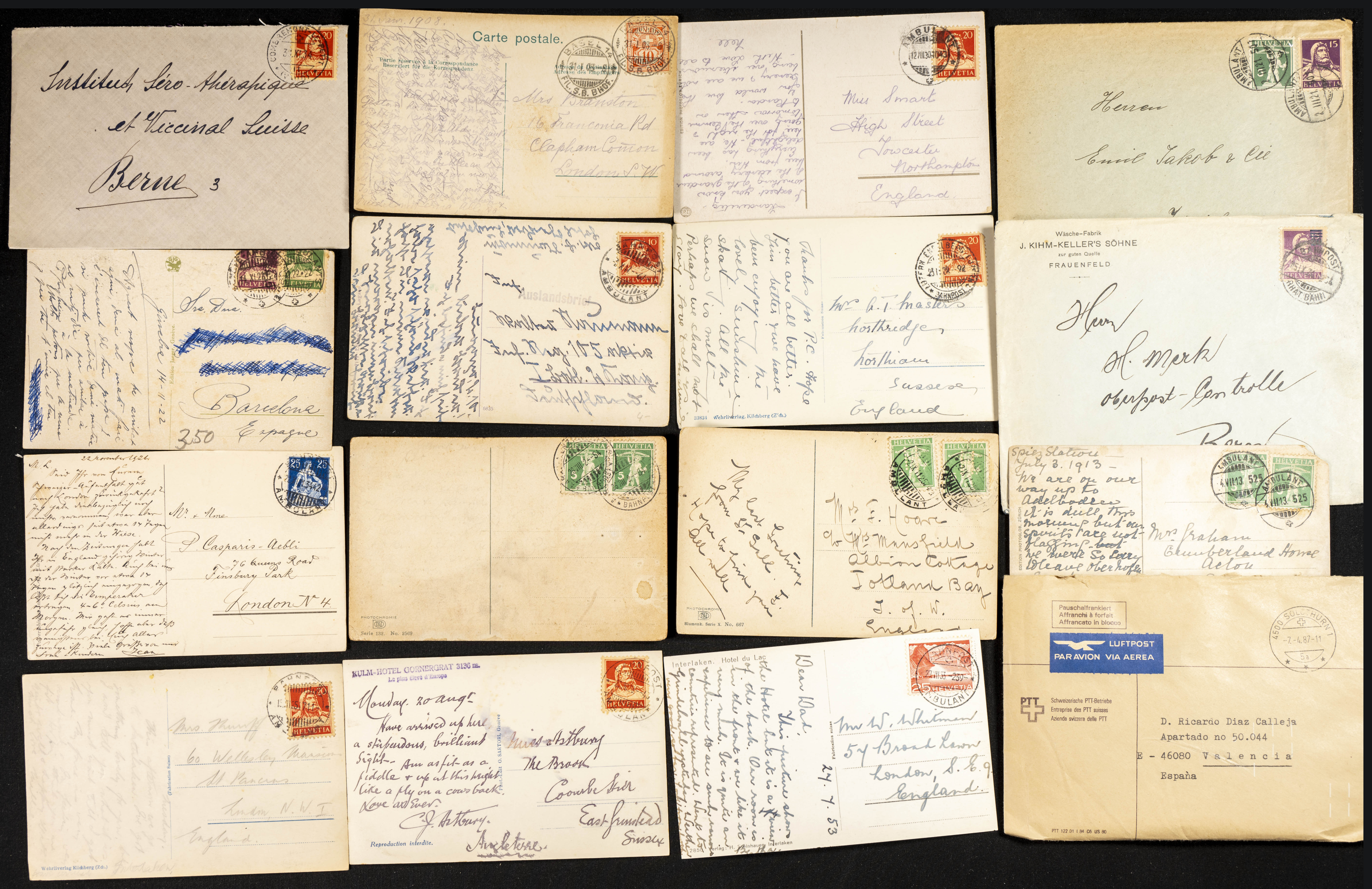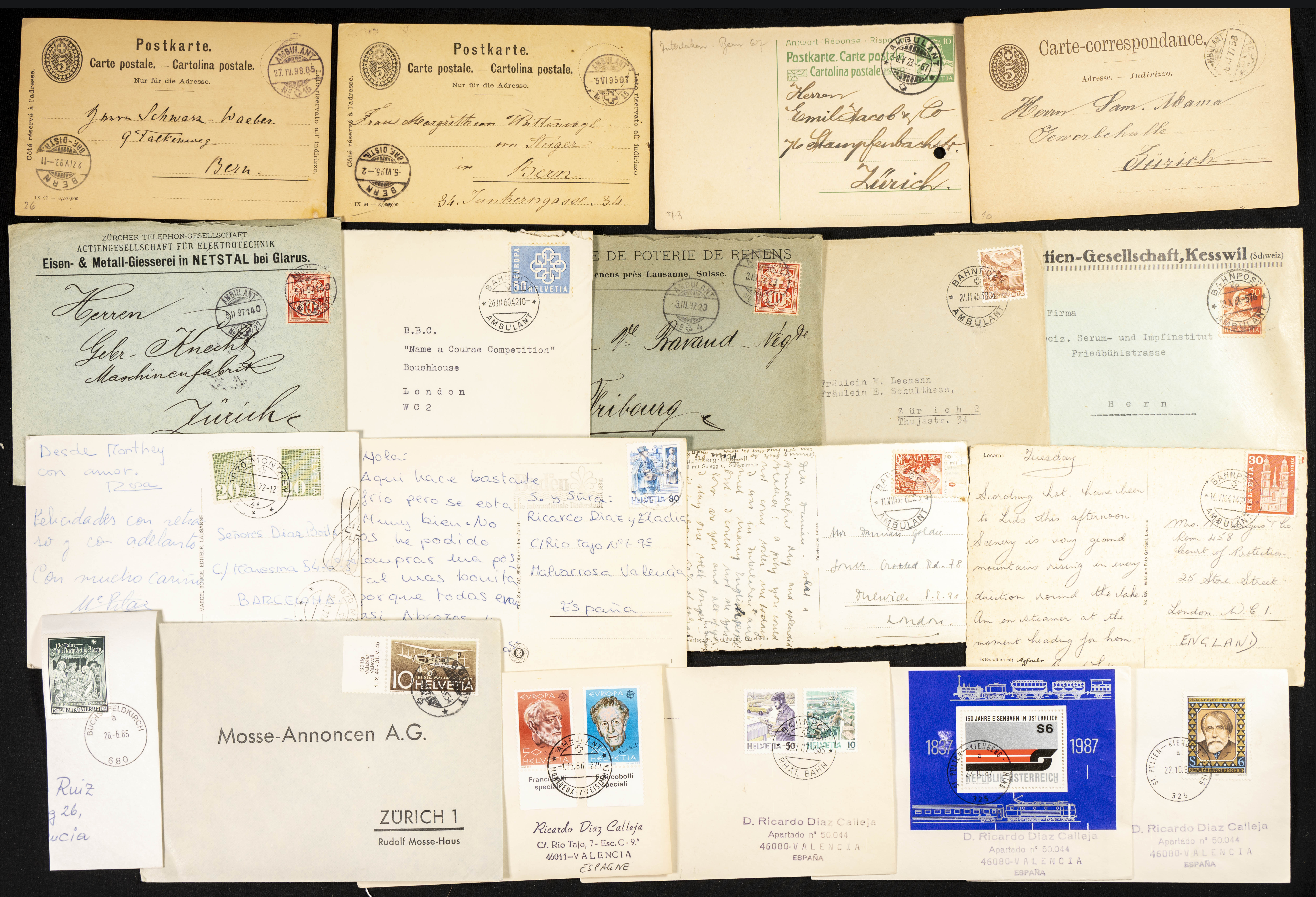 (1907ca). Interesante conjunto de decenas de cartas y tarjetas postales de Suiza circuladas entre 1907 y 1987 con matasellos ambulantes en su mayoría, incluye fragmentos, alguna Tarjeta Entero Postal y sobres y fragmentos de Austria con ambulantes austriacos, además de artículos y un catálogo de estos matasellos. A EXAMINAR.